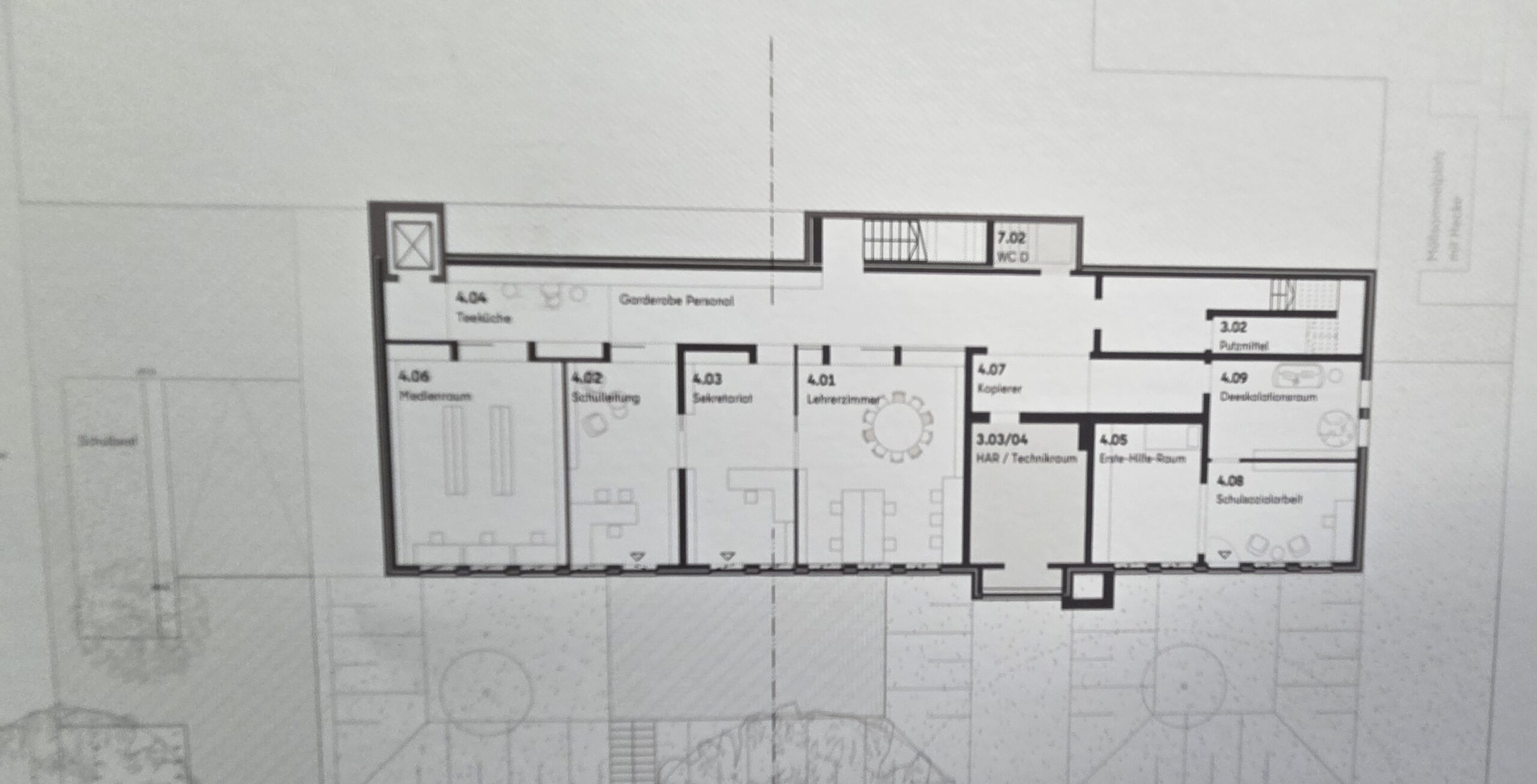 - Modellplan der GS Mühlenbergschule Osloß, zeigt Klassenräume, Lehrerecke, Gemeinschaftsräume und technische Einrichtungen, gestaltet für eine förderliche Lernumgebung und optimalen Schulbetrieb.