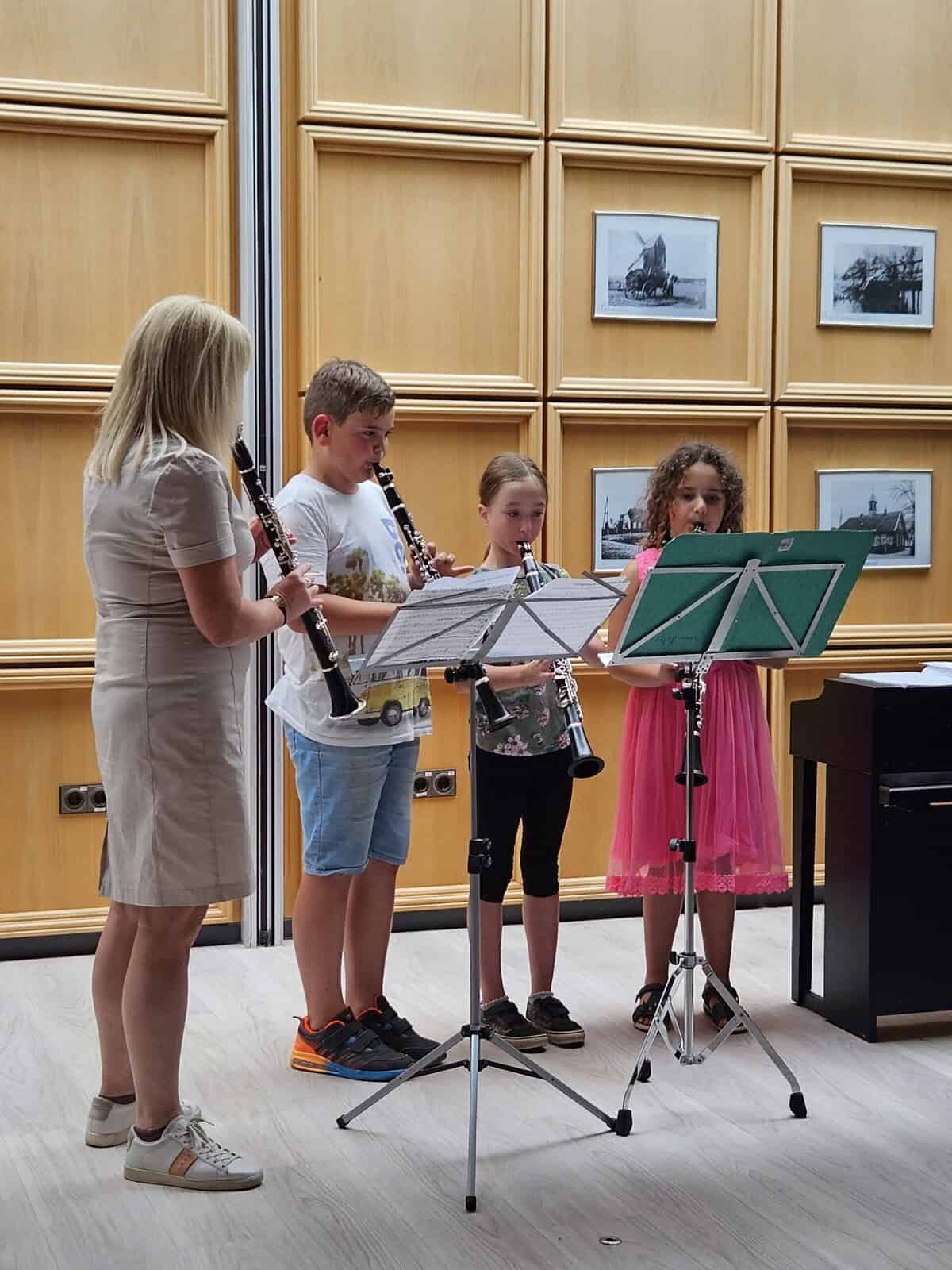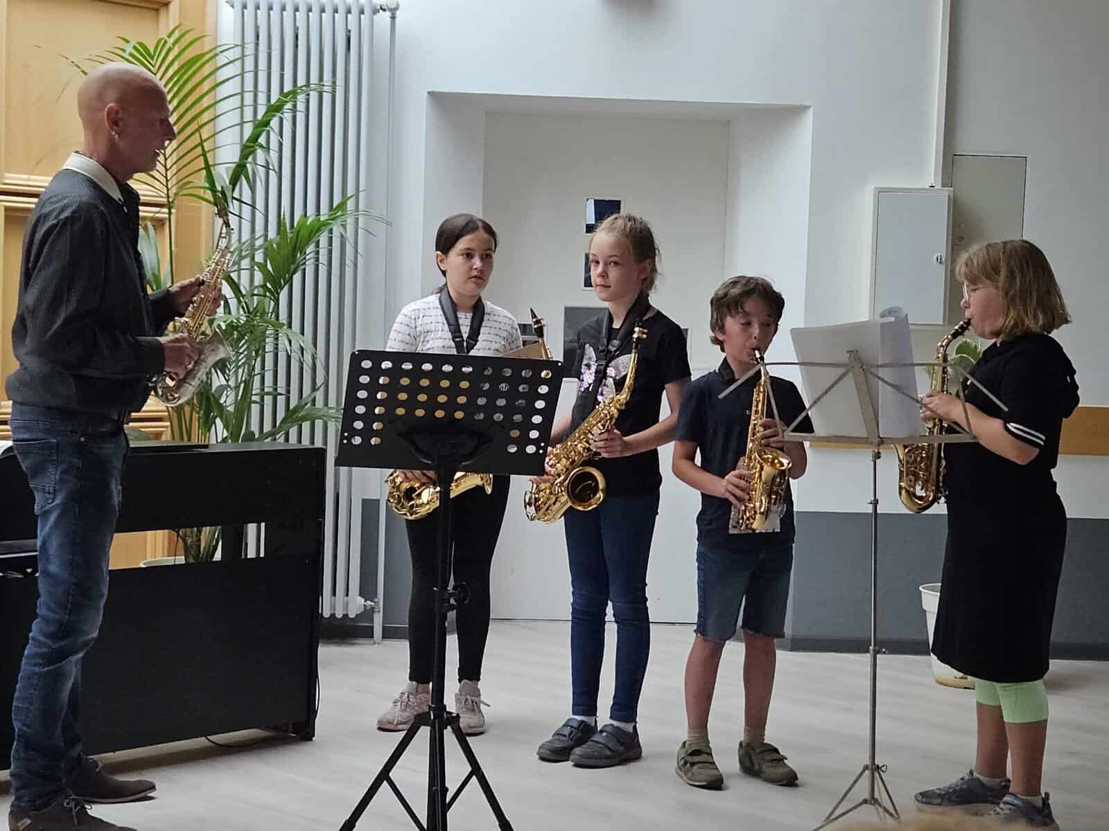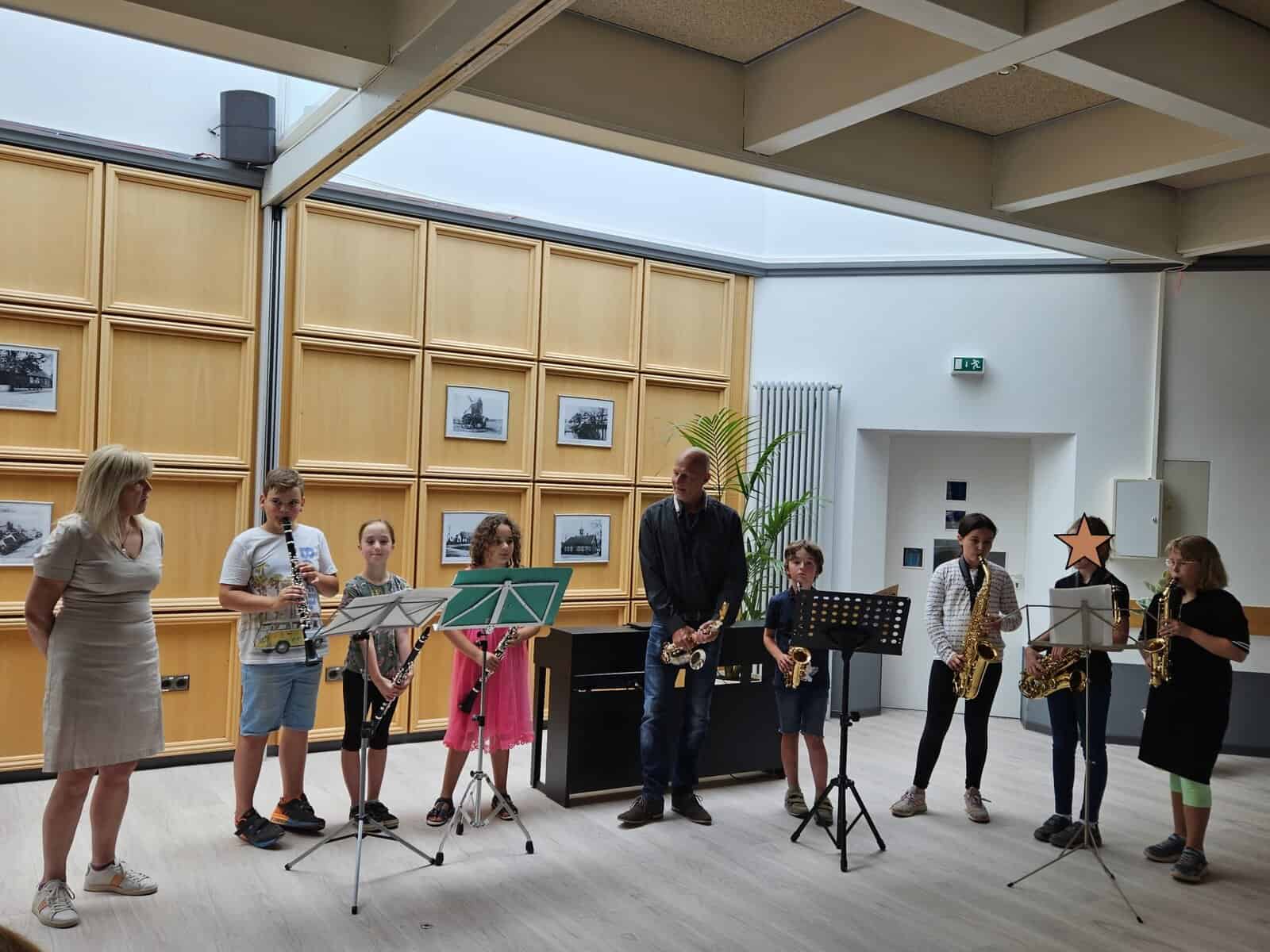 Zusammen mit Instrumentallehrerin Anita Keller und Instrumentallehrer Hans-Jürgen Kampa konnten die Klarinetten und Saxofone ihr Können vor Publikum unter Beweis stellen und natürlich gehörte auch eine Portion Lampenfieber dazu. Nach kürzeren Satzstücken der einzelnen Instrumentalgruppen folgte am Ende ein gemeinsamer Blues im Tutti und ein erstes Saxofonsolo mit Klavierbegleitung von Mara Sobirey sorgte für Applaus und Begeisterung. Die Kinder haben in diesem Jahr viel gelernt und mitgenommen und waren auf dem richtigen Weg gemeinsam musizieren zu können.