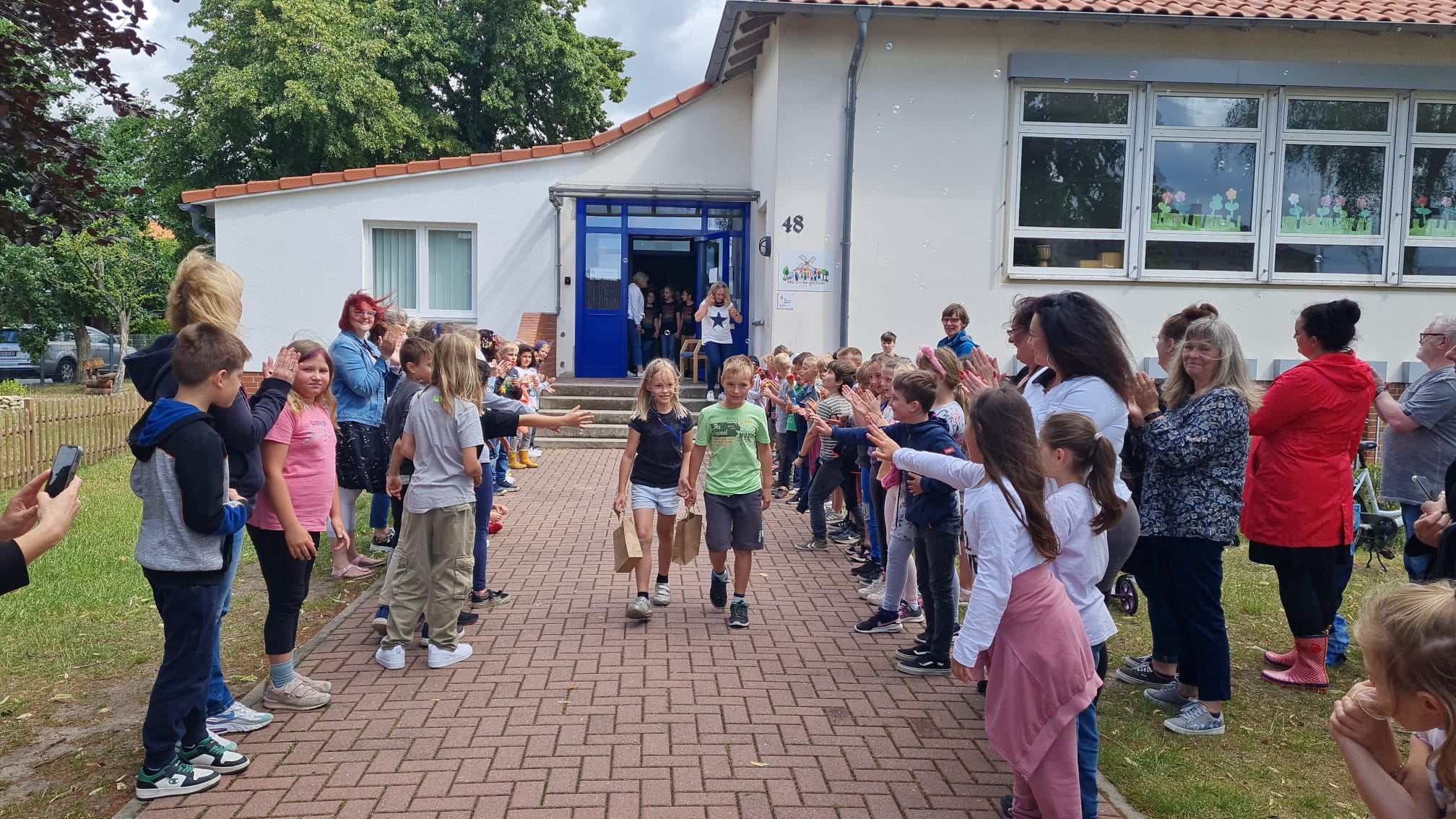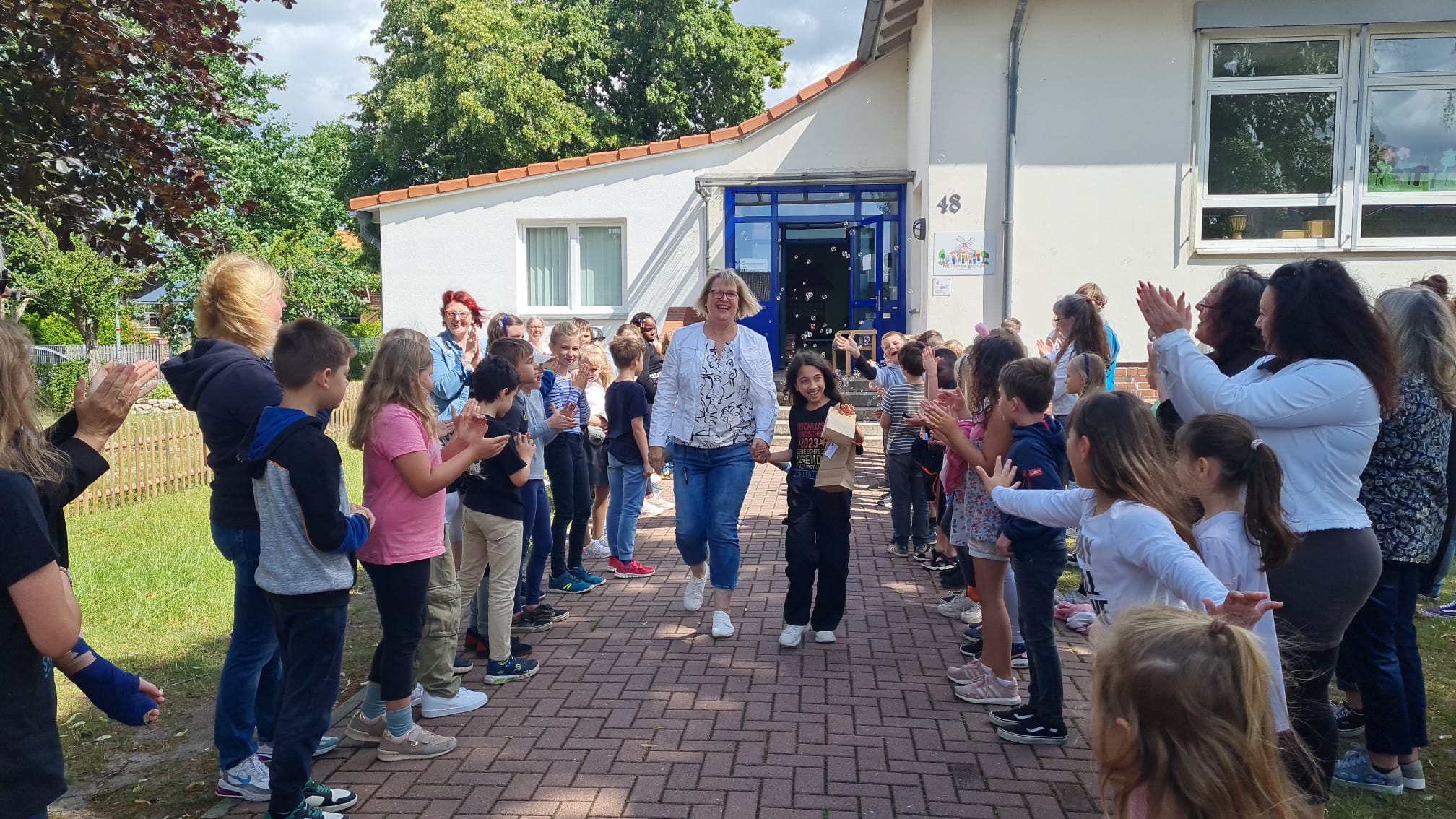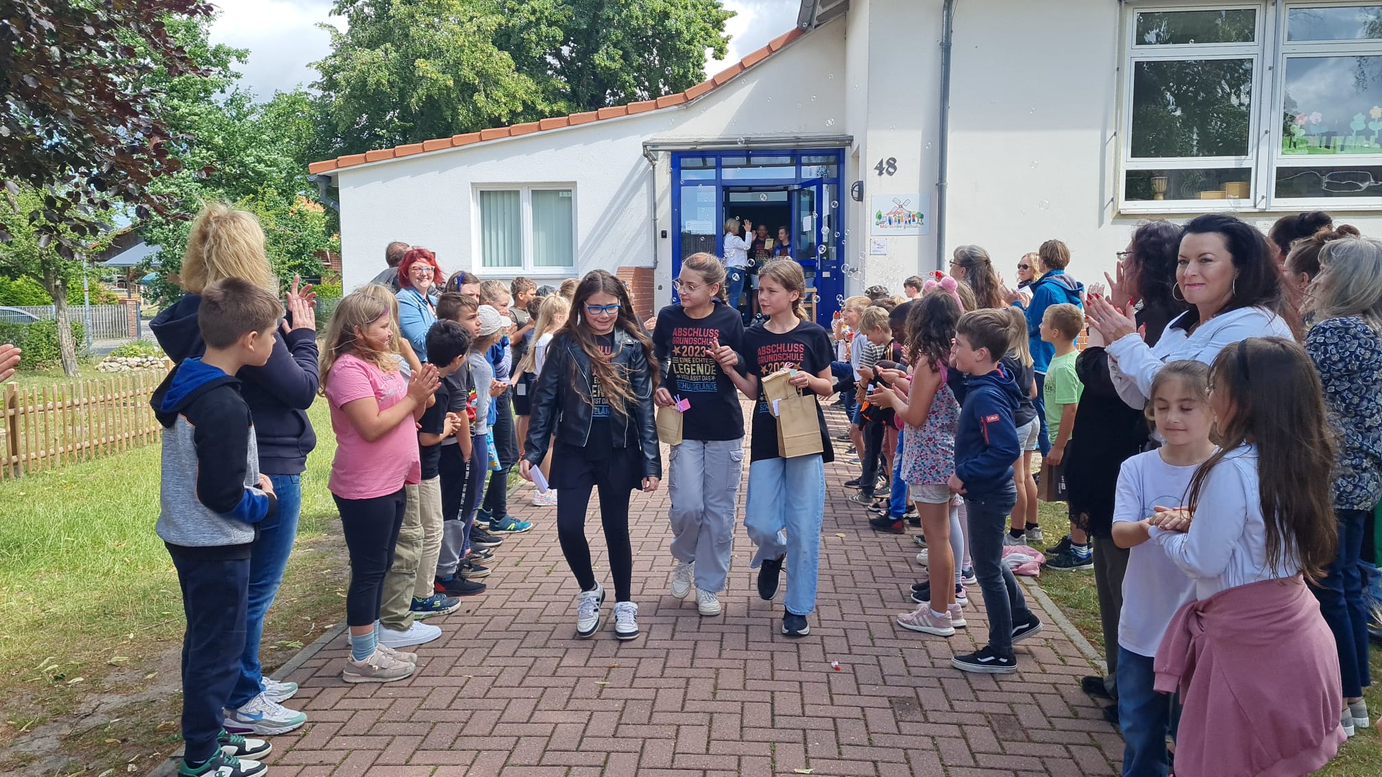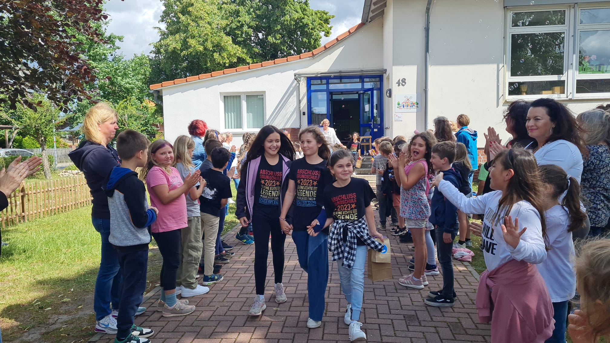 Am Mittwoch, den 05.07.2023 wurde unseren fünfzehn ViertklässlerInnen um 10 Uhr auf dem Schulhof mit einem wunderbaren, bunten, abwechslungsreichen und musikalischen Programm verabschiedet. Alle Klassen hatten einen kleinen Programmpunkt einstudiert, um die Großen gebührend verabschieden zu können. Es war eine wunderschöne Abschiedsfeier, bei dem am Ende auch ein paar Tränchen flossen. Zum Abschied wurden die Viertis von den Erstklässlern, ihren Paten, in einem Spalier aus Seifenblasen aus der Schule gepustet. Wir wünschen euch einen wundervollen Start an der neuen Schule, viel Erfolg, nette Lehrer und tolle neue Freunde. Vergesst uns nicht und kommt uns gern mal besuchen!