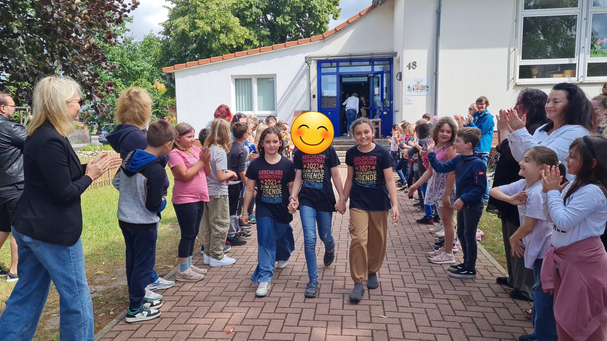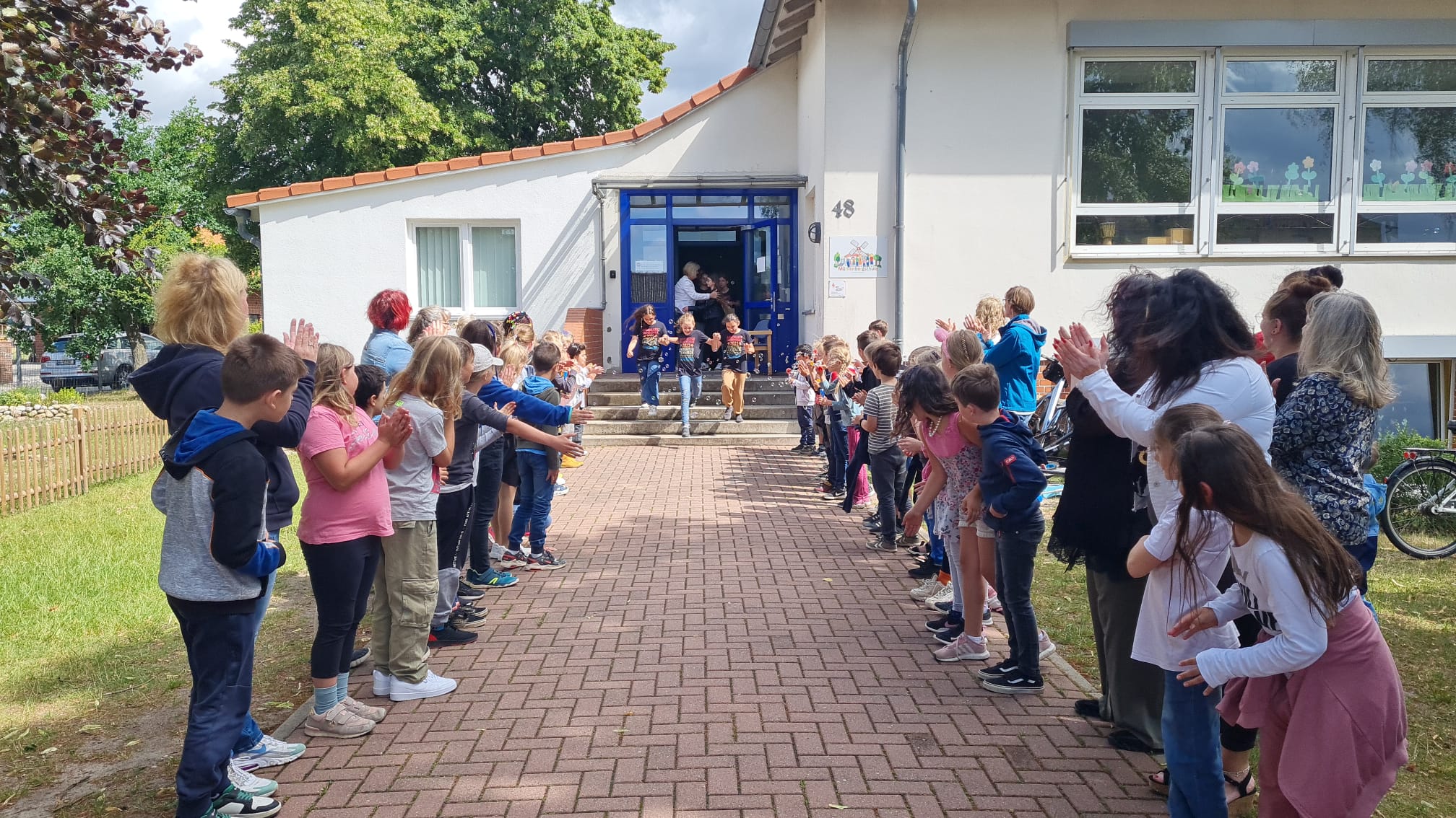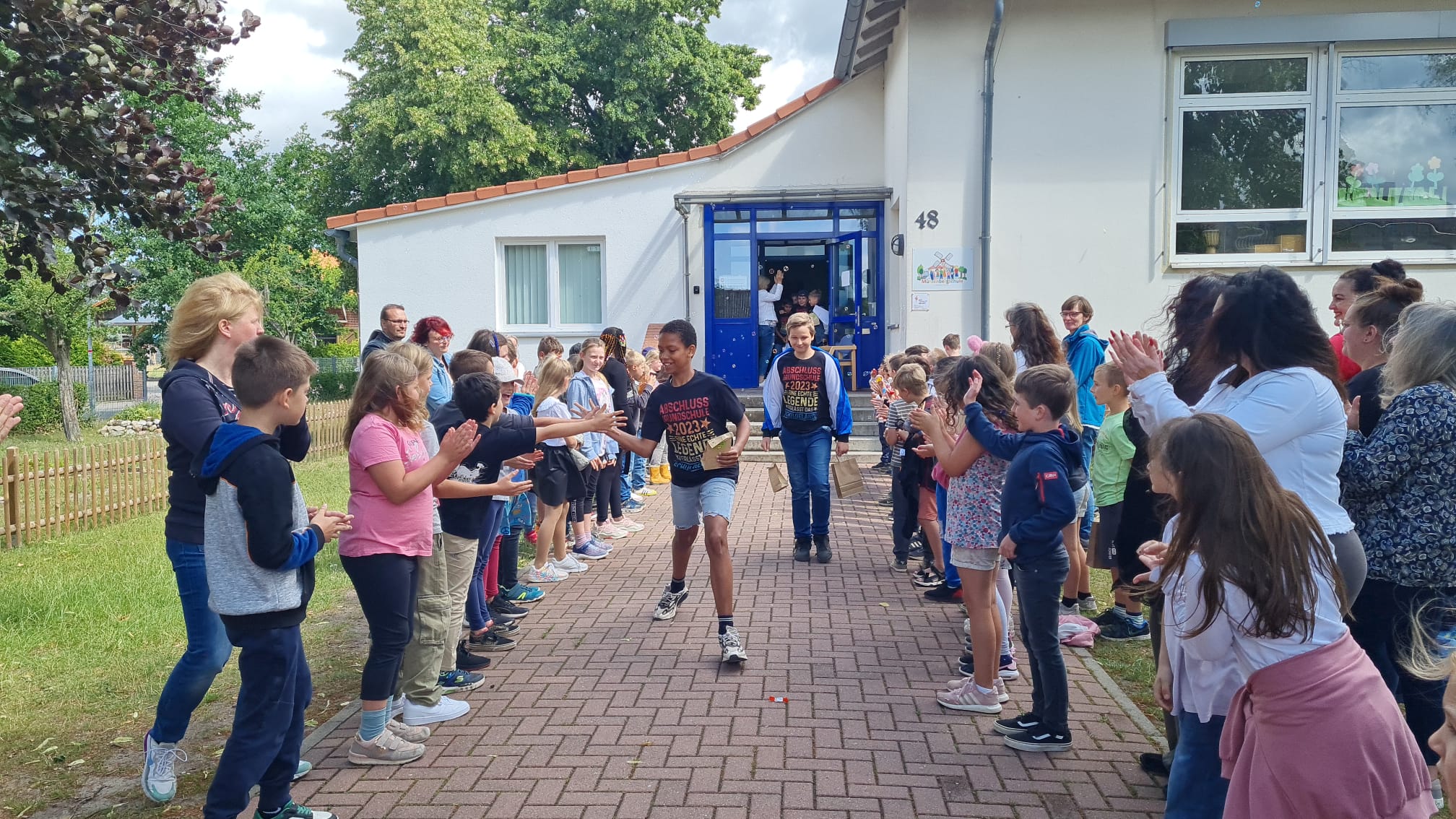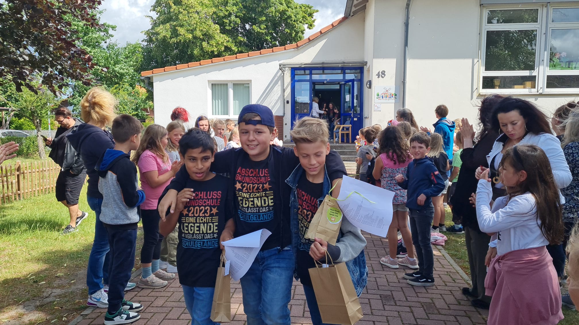 Am Mittwoch, den 05.07.2023 wurde unseren fünfzehn ViertklässlerInnen um 10 Uhr auf dem Schulhof mit einem wunderbaren, bunten, abwechslungsreichen und musikalischen Programm verabschiedet. Alle Klassen hatten einen kleinen Programmpunkt einstudiert, um die Großen gebührend verabschieden zu können. Es war eine wunderschöne Abschiedsfeier, bei dem am Ende auch ein paar Tränchen flossen. Zum Abschied wurden die Viertis von den Erstklässlern, ihren Paten, in einem Spalier aus Seifenblasen aus der Schule gepustet. Wir wünschen euch einen wundervollen Start an der neuen Schule, viel Erfolg, nette Lehrer und tolle neue Freunde. Vergesst uns nicht und kommt uns gern mal besuchen!