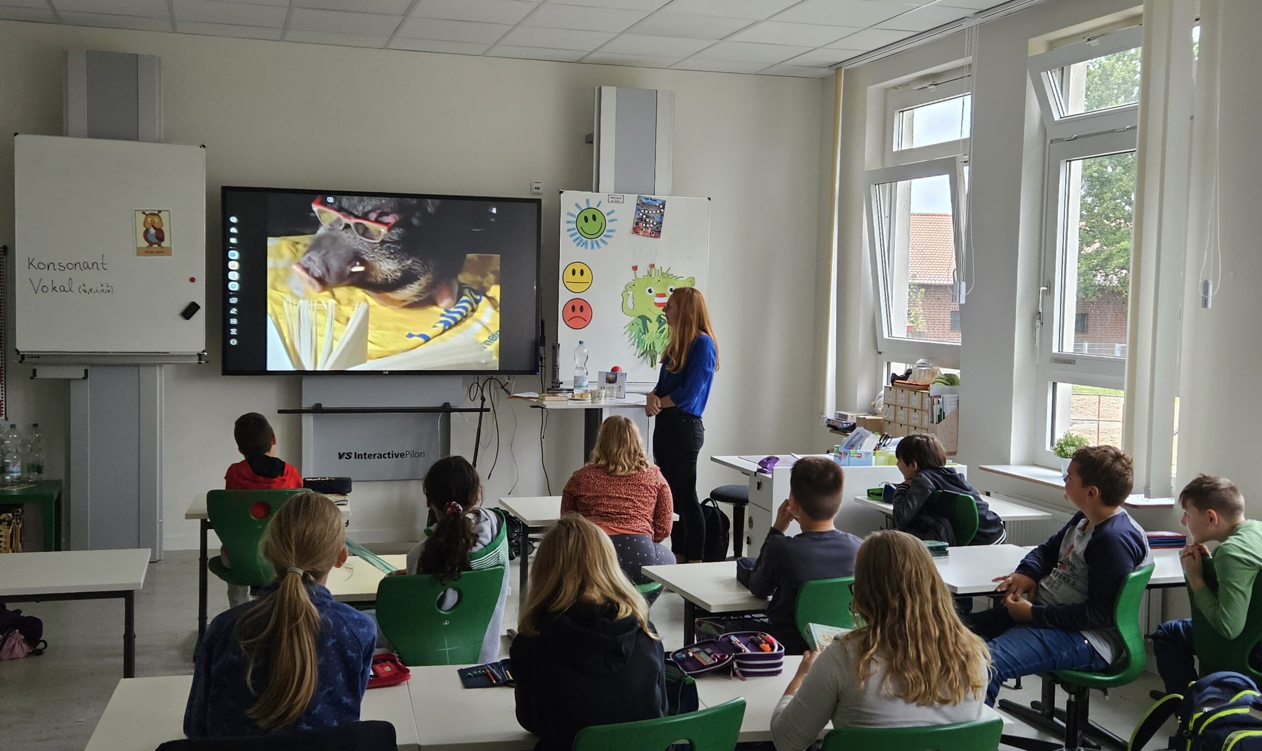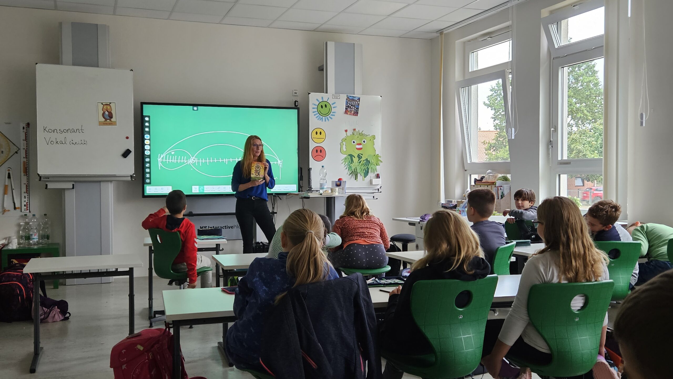 Kurz vor den Herbstferien hatten die Mühlenbergkinder Besuch von Autorin Nina Weger. Über den Friedrich Bödecker Kreis war aus Erfahrung schnell eine gute Autorin für unsere Kinder gefunden und Frau Weger entpuppte sich in allen Klassen als wahre Vorleseheldin. Ihre Lesungen waren geprägt von Lebendigkeit und Bewegung und glichen einer „One-woman-show“ im Theater. Die Kinder klebten an ihren Lippen und waren begeistert von der Vielzahl ihrer Bücher und den spannenden Geschichten. Klasse 1 und 2 kamen in den Genuss von „Räuber Rapido“, der eigentlich gar kein richtiger Räuber ist und durch sein gutes Benehmen und die Freude am Lesen nicht unbedingt den Wünschen seines Vaters, dem Räuberhäuptling entspricht. Klasse 3 begeisterte sich an Nina Wegers Roman „Club der Heldinnen„, eine Abenteuergeschichte über drei Mädchen in einem Internat, in das man nur aufgenommen wird, wenn man besondere Talente besitzt und Klasse 4 erfreute sich an „Die sagenhafte Saubande„. Besonders lustig war es, als die Kinder erfuhren, dass es Max, das Schwein aus der Saubande wirklich gibt und Nina Wegers erstes Buch durch Max persönlich signiert wurde, da er ihr ins erste druckfrische Buch in den Buchdeckel biss und eine Seite fraß.