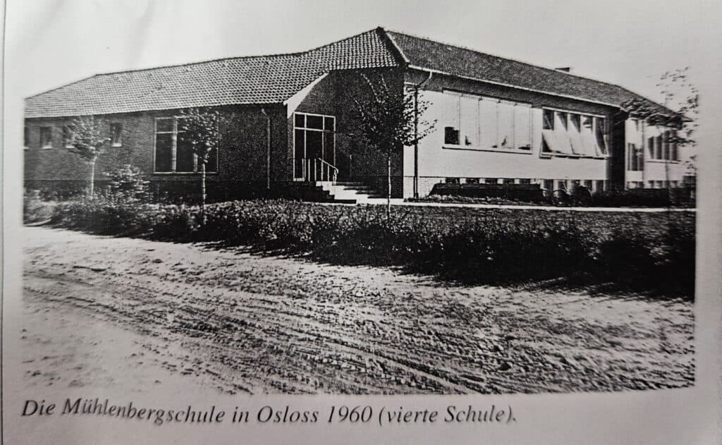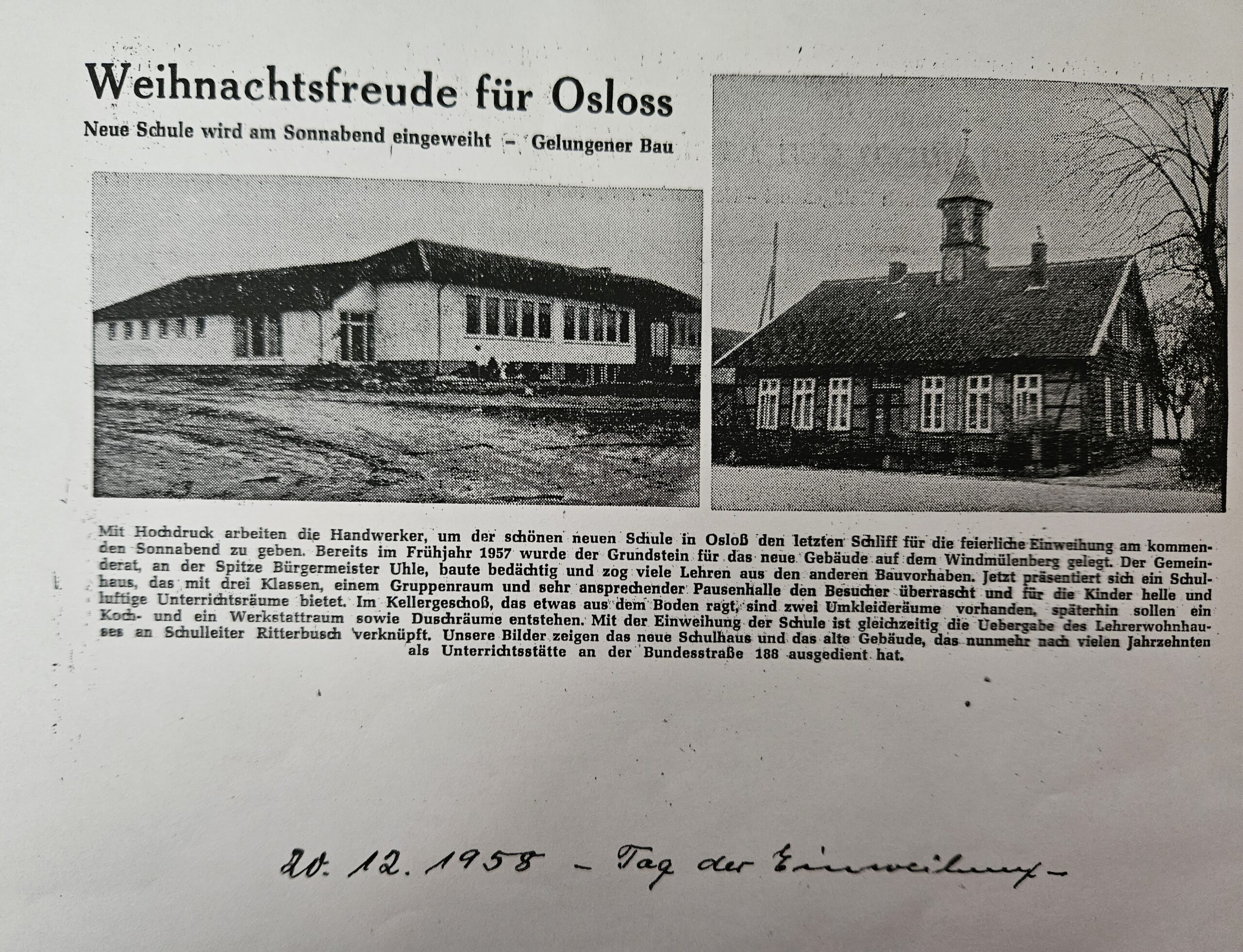 Die Allerzeitung schreibt am 16.10.1957: „Osloß verändert seine Struktur: Die Einwohnerzahl ist seit der Vorkriegszeit von 280 auf 780 Einwohner im Jahr 1957 gestiegen. Die Siedlungsgemeinde Osloß gilt als begehrt für das VW-Werk, 1/3 der Einwohner fährt zur Arbeit in die nahegelegenen Städte.“ Wegen der Vergrößerung des Ortes wird ein Schulneubau notwendig. Am 5.4.1957 wird im Gemeinderat mit Herrn Bürgermeister Uhle der Beschluß des Neubaus einer dreiklassigen Schule und eines Lehrerhauses gefaßt. Als Baugelände wird der Sportplatz am Osterberg vorgesehen. Die vier Morgen Pachtland, dem Bauern Grußendorf gehörend, werden für 18.000DM gekauft, Bauplanung und Finanzierung in Angriff genommen, die Gesamtkosten mit 261.500 DM berechnet. Die Kreisschulbaukasse beteiligt sich mit 27.000 DM, das Land Niedersachsen mit 19.613 DM an dem Bau. Die Gemeinde Osloß legt am 14.6.1957 den Grundstein der vierten Schule. Der Tag der Einweihung ist der 18.12.1958. Wegen der weiterwachsenden Schülerzahlen werden im Laufe der folgenden Jahre An- und Umbauten nötig. Inzwischen werden hier mehr als 100 Grundschüler (Klasse 1-4) von sechs Lehrkräften unterrichtet.