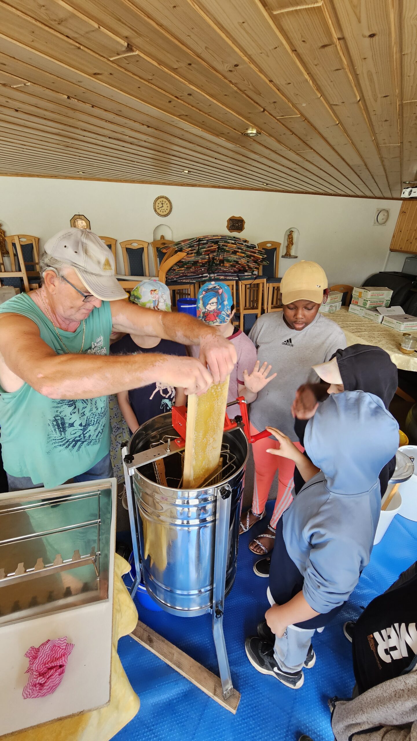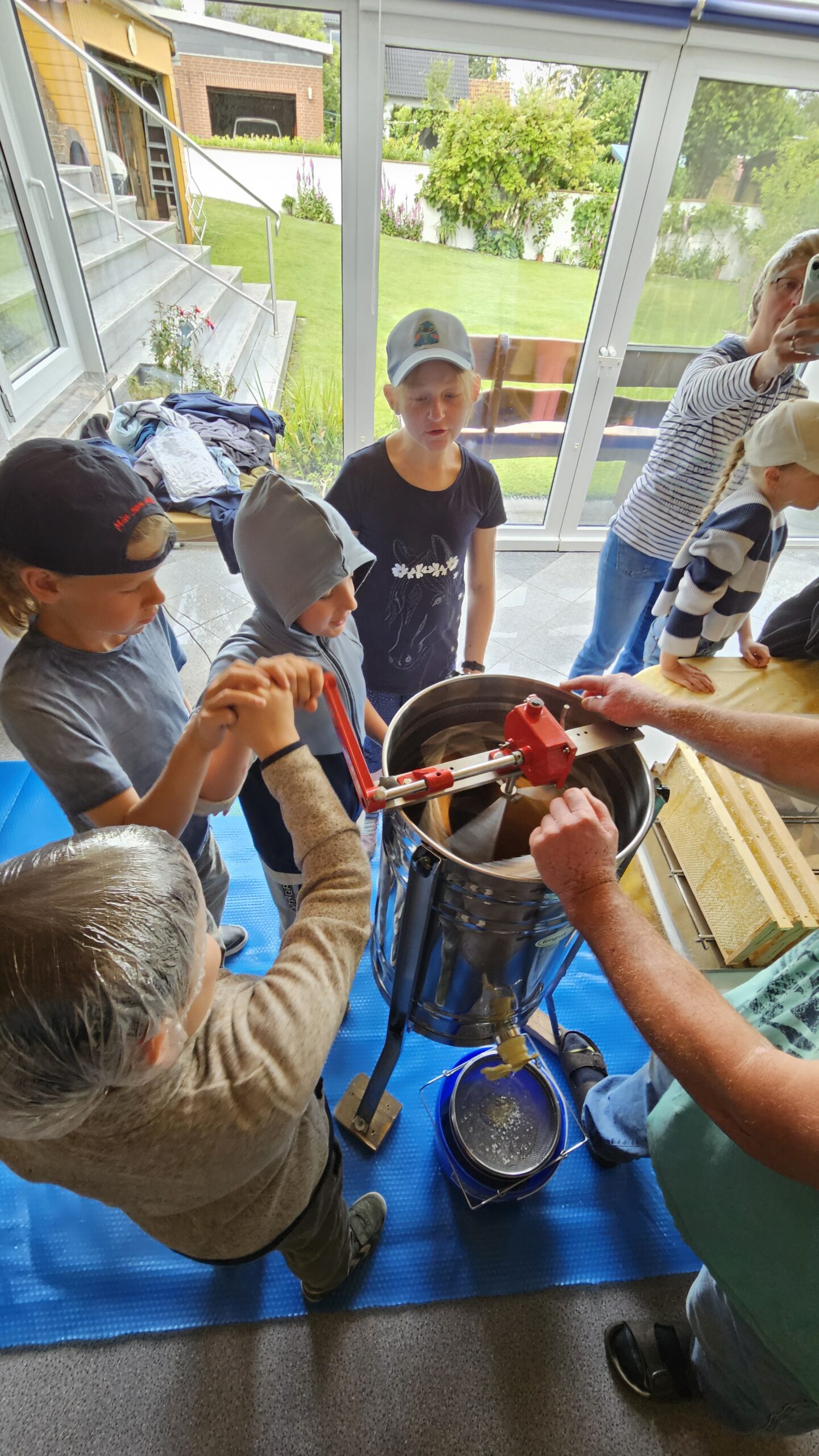 In einem zweiten Schritt wurde der Honig in der Schleuder geschleudert. Damit keine Unwucht erzeugt wird, wurden immer drei Honigrähmchen in die Schleuder gepackt und dann hieß es kräftig kurbeln, um den Honig zu lösen und abfließen zu lassen.