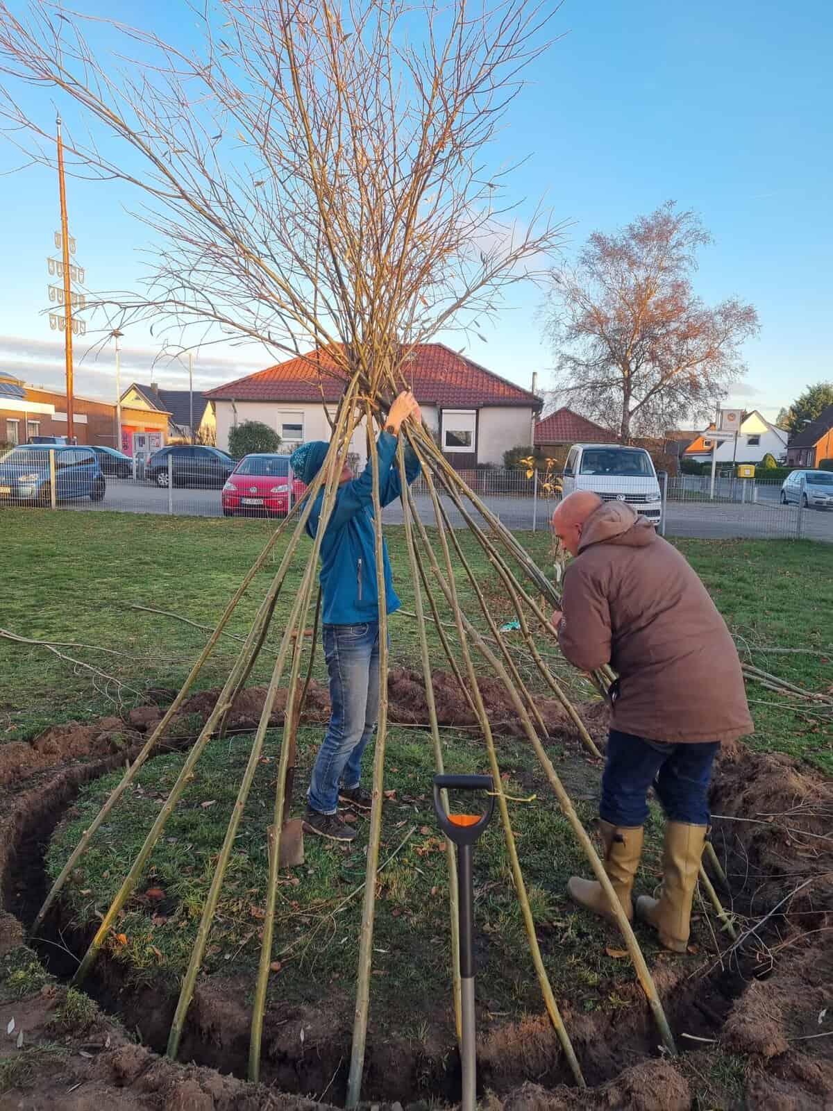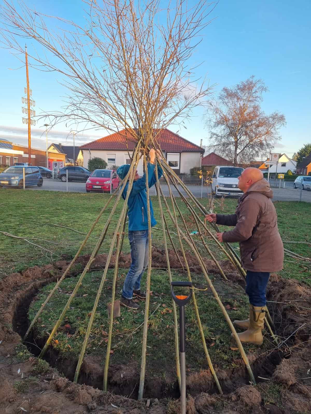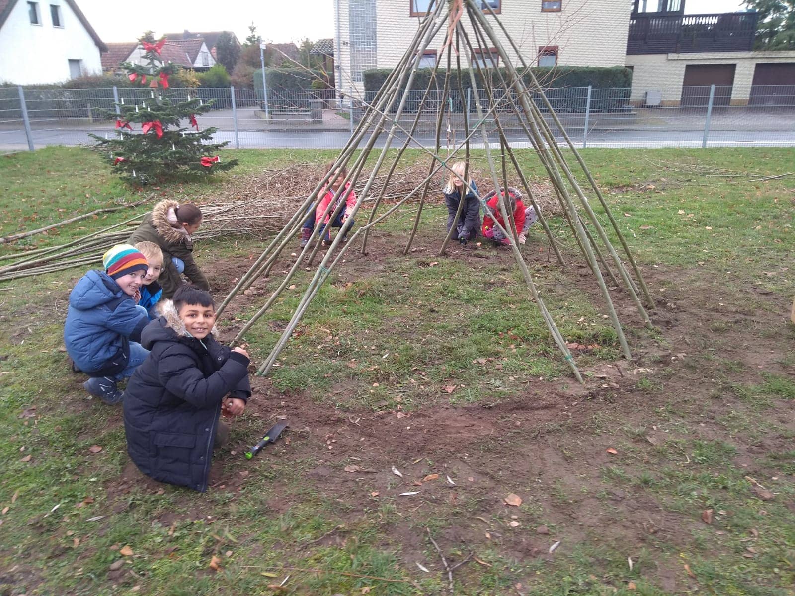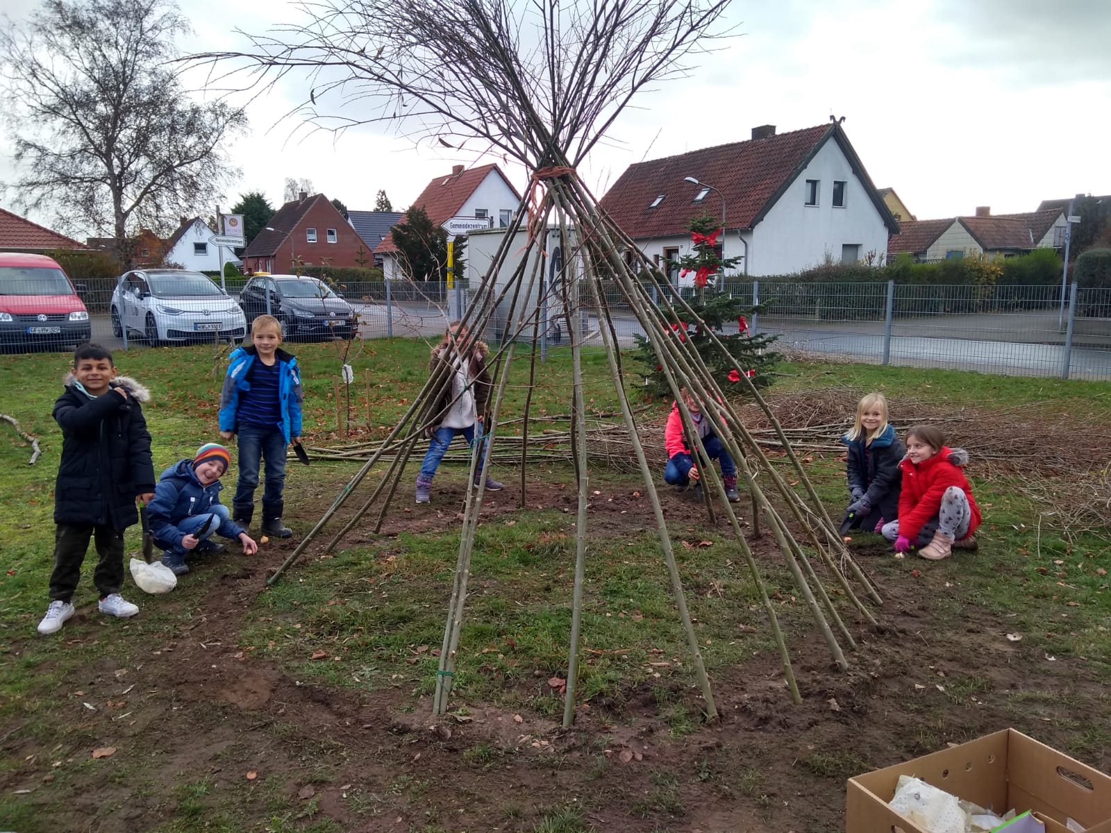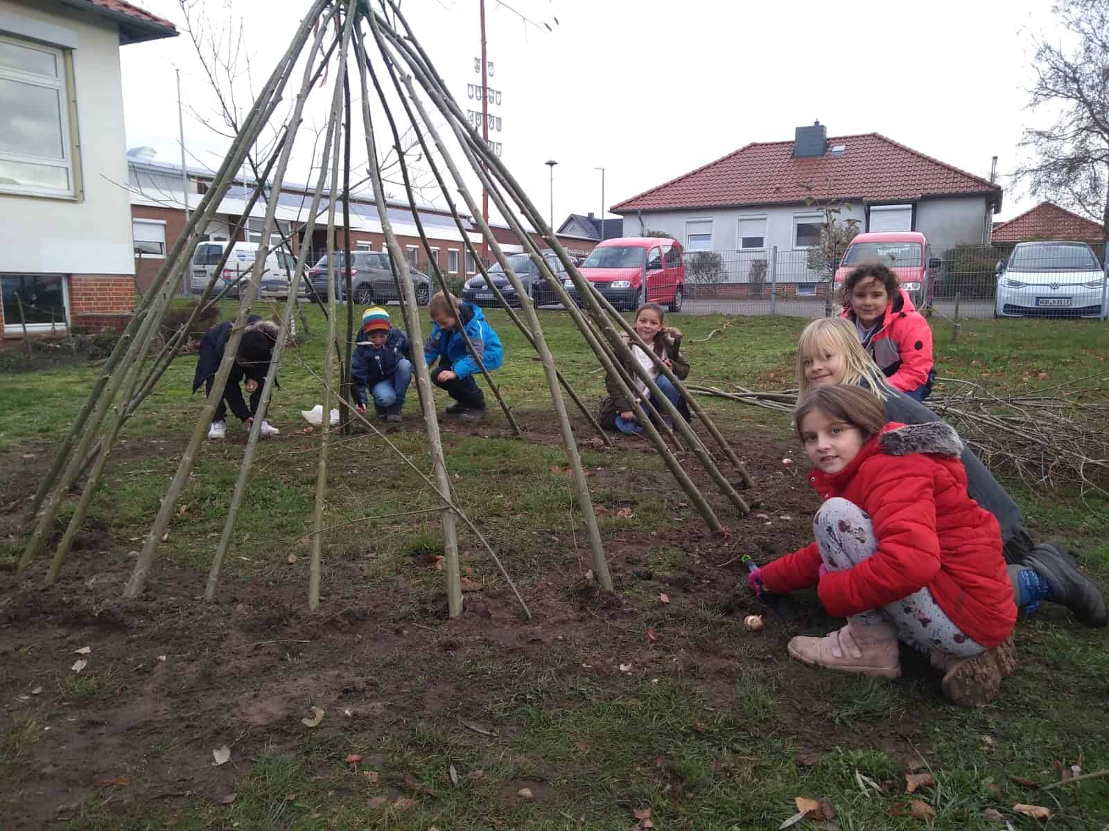 Am 23.11.22 haben wir gemeinsam mit Frau Heller ein Weidentipi auf unserem Schulhof errichtet. Die Weidenäste stammen vom Barnbruch, die im Rahmen unseres Gemeinde-Umwelttages am 12.11.22 geschnitten wurden. Im Anschluss hat die zweite Klasse noch fleißig Blumenzwiebeln um das Tipi gesteckt. Die übrigen dicken Weidenäste nutzen wir für einen Zaun, rund um unser Blumenbeet.