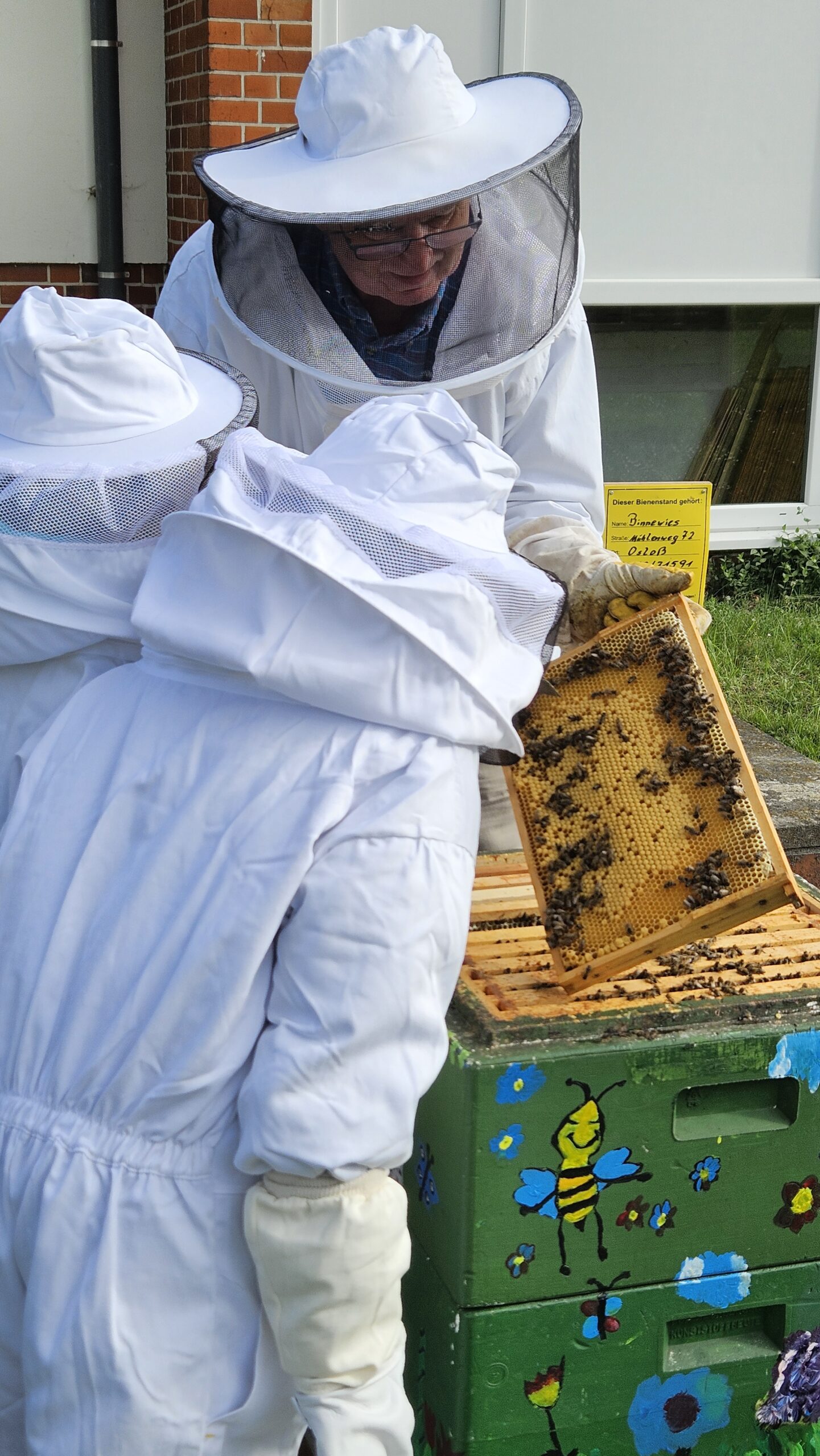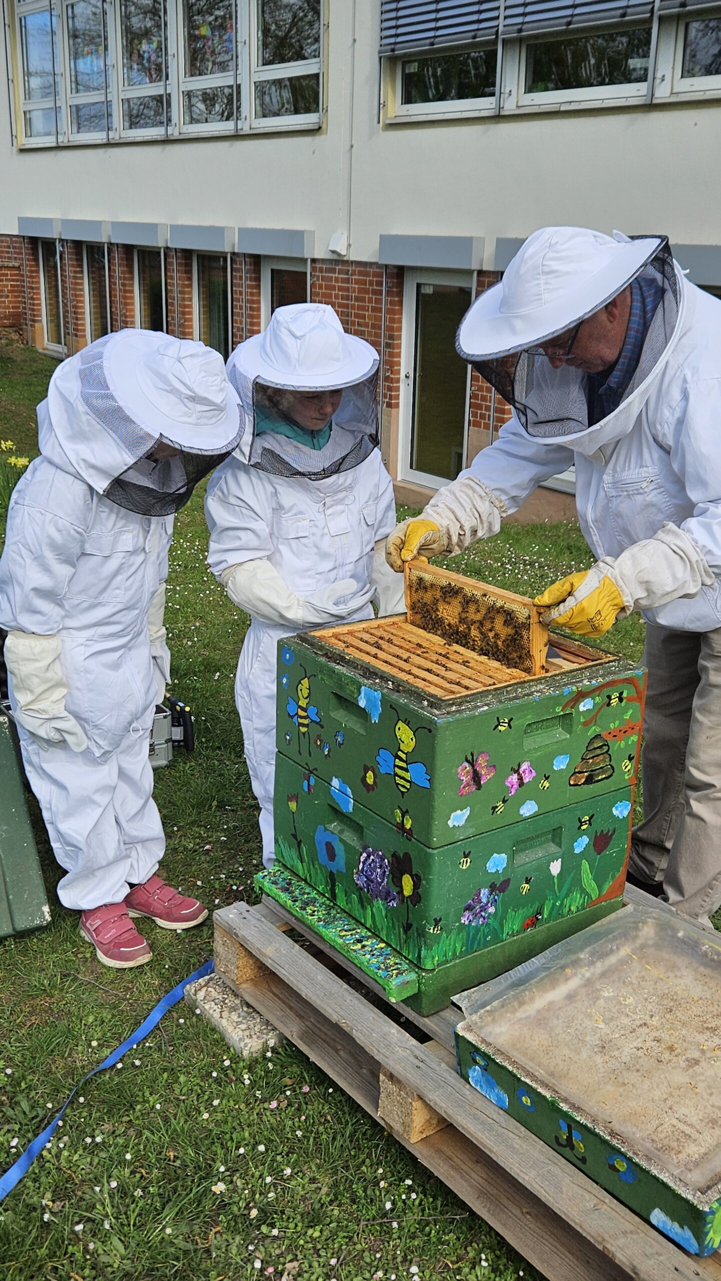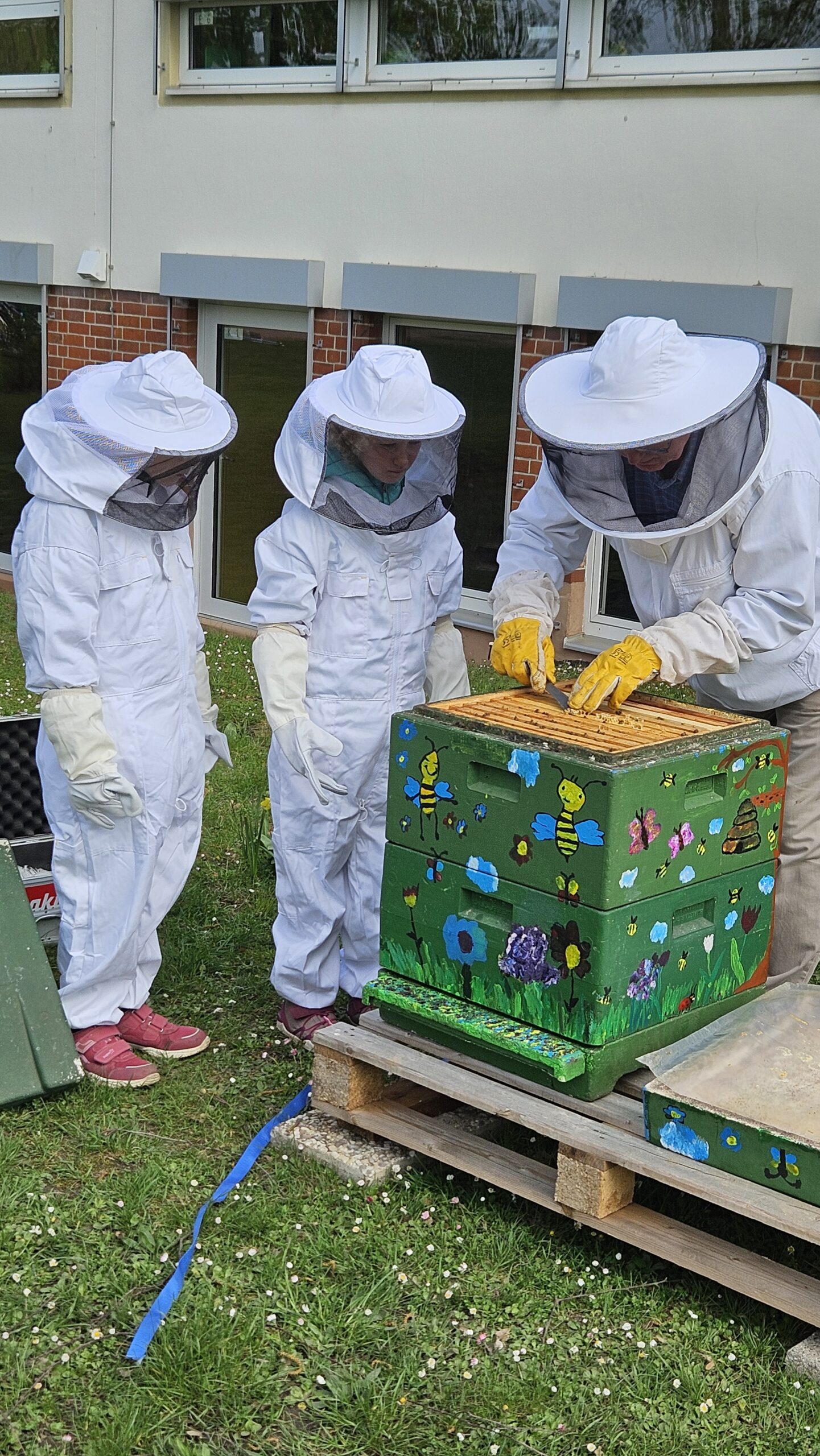 Heute wurden erstmalig zwei der zehn Imkeranzüge eingeweiht und gemeinsam mit Imker Uli Binnewies wurde das Innere der Bienenbeute betrachtet, die Königin gesucht, Waben entdeckt und die einzelnen Rähmchen erforscht. Für Paula und Malu (Kl.2) war das ein großes Abenteuer und die beiden haben mutig ihre Imkerqualitäten unter Beweis gestellt.
