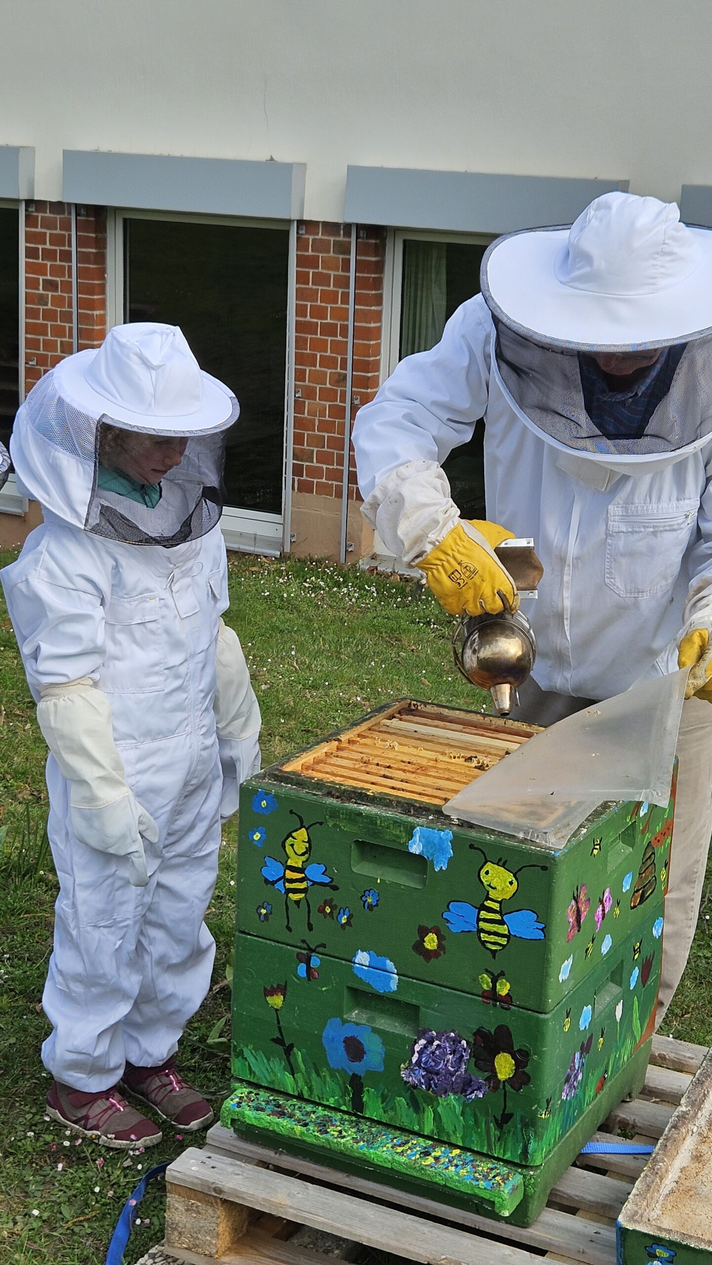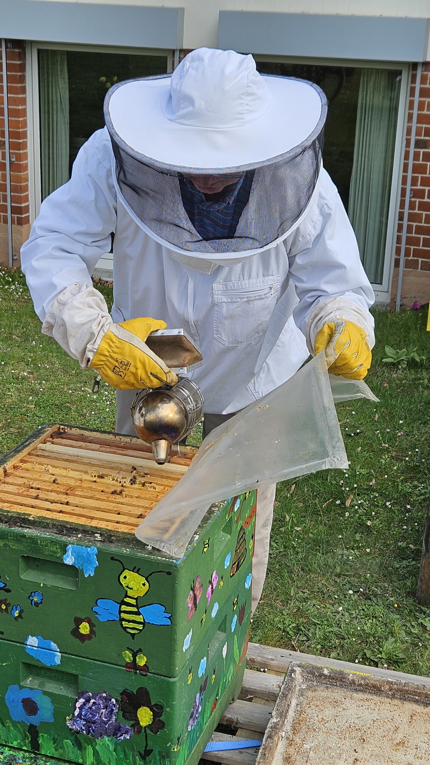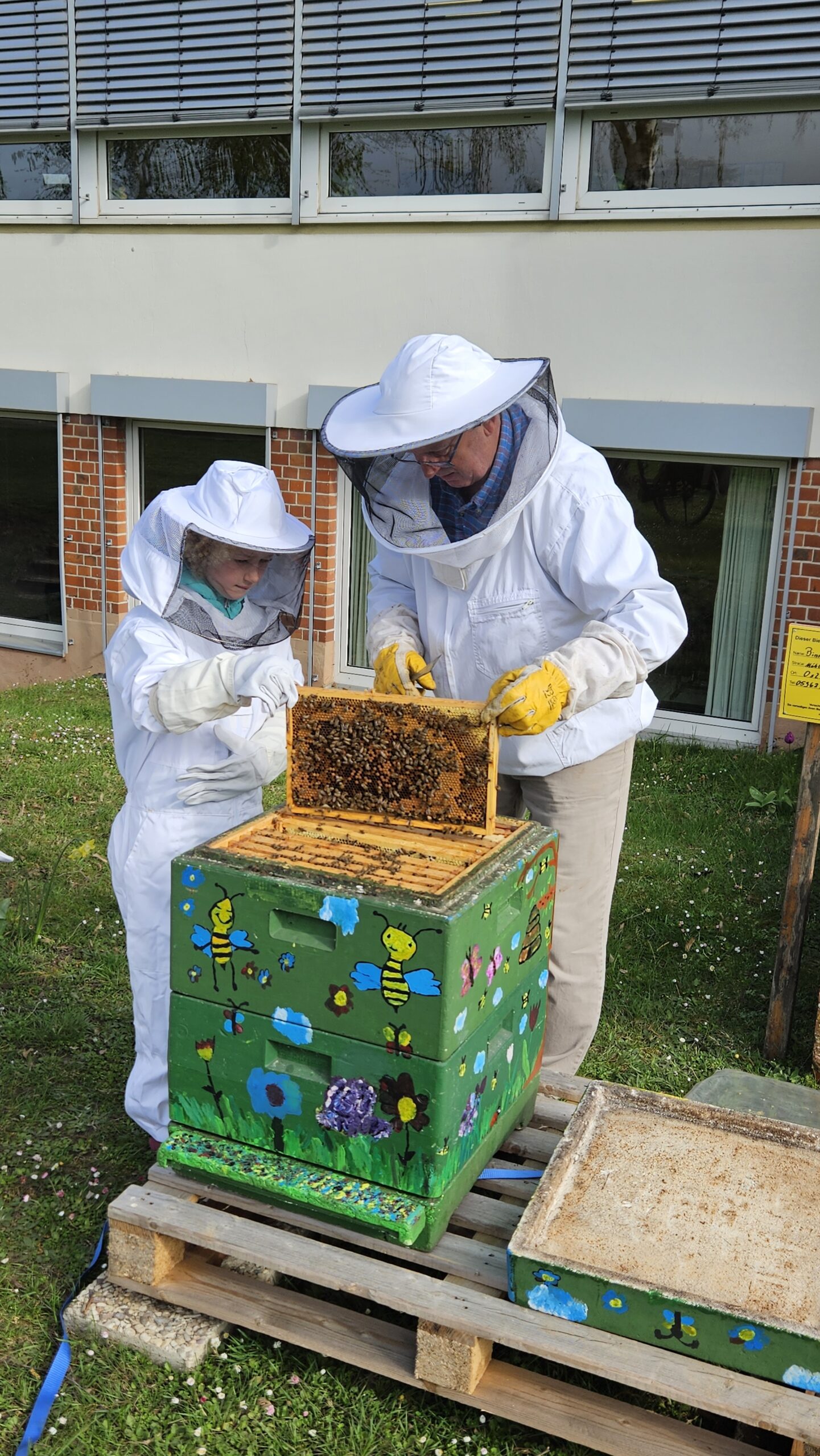 Heute wurden erstmalig zwei der zehn Imkeranzüge eingeweiht und gemeinsam mit Imker Uli Binnewies wurde das Innere der Bienenbeute betrachtet, die Königin gesucht, Waben entdeckt und die einzelnen Rähmchen erforscht. Für Paula und Malu (Kl.2) war das ein großes Abenteuer und die beiden haben mutig ihre Imkerqualitäten unter Beweis gestellt.