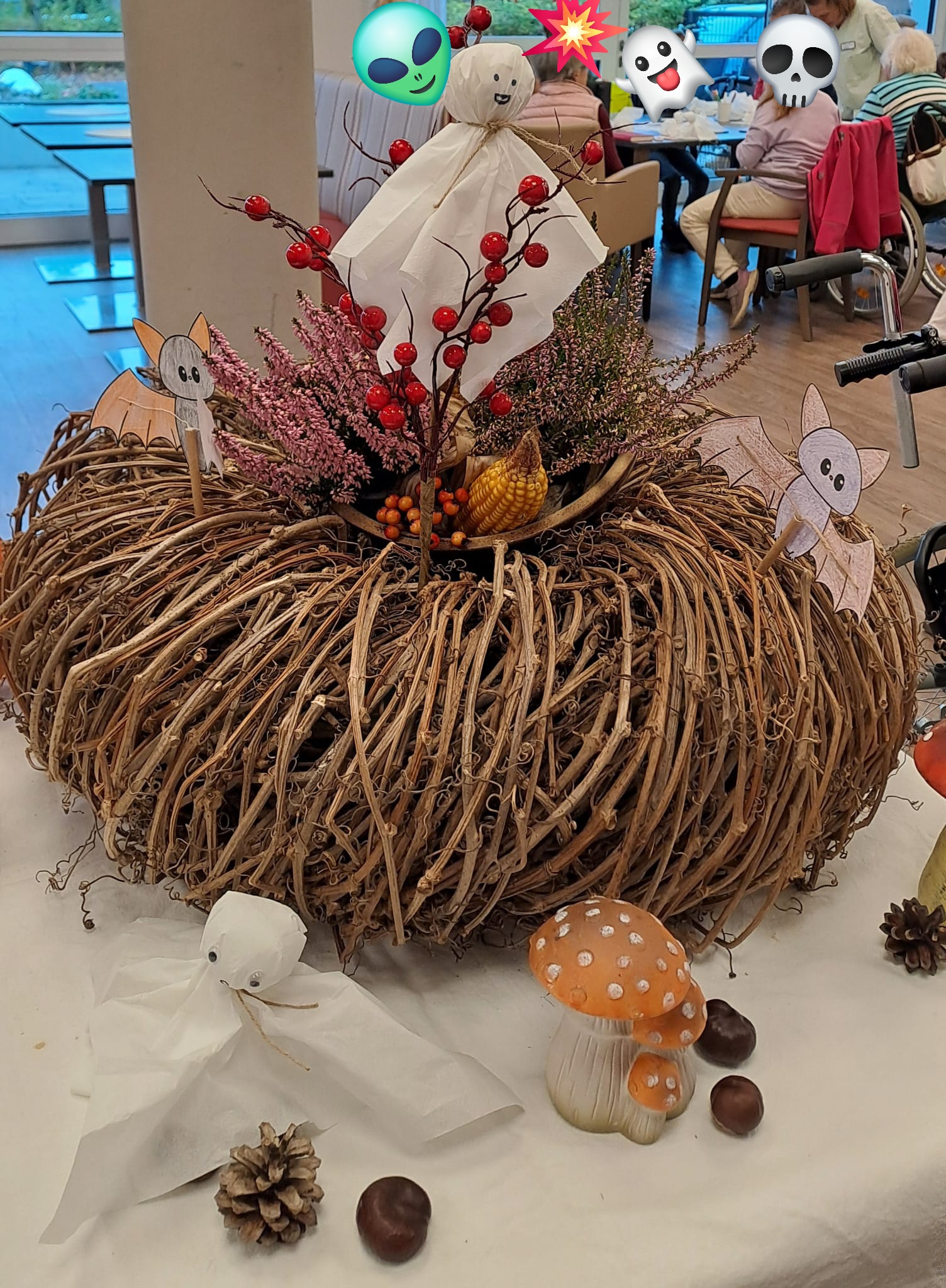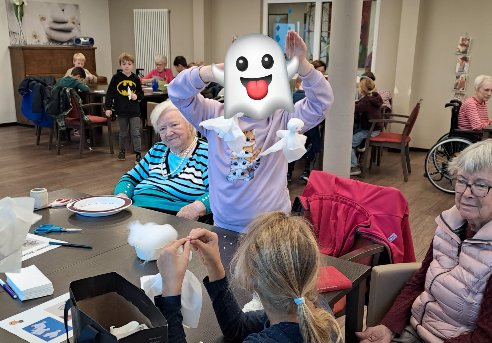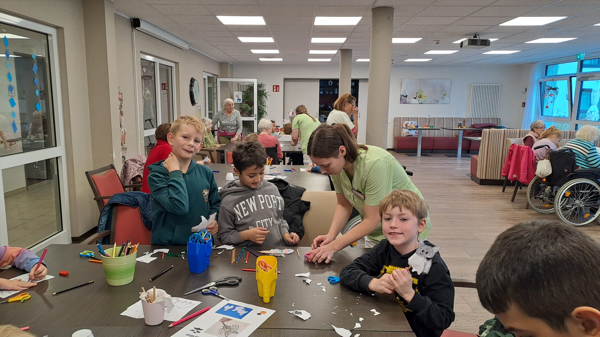 Schnell hatten sich die Kinder entschieden und an den liebevoll vorbereiteten Tischen Platz genommen. Dort warteten schon einige Bewohnerinnen des Heimes, die entweder mitbastelten, den Kindern halfen oder sich mit ihnen unterhielten. Stolz präsentierten die Kinder ihre Geister und Fledermäuse und bedankten sich mit einem fröhlichen Lied. Zum Schluss sangen alle ein von einer Bewohnerin vorgetragenes Lied, das schnell zu erlernen war.