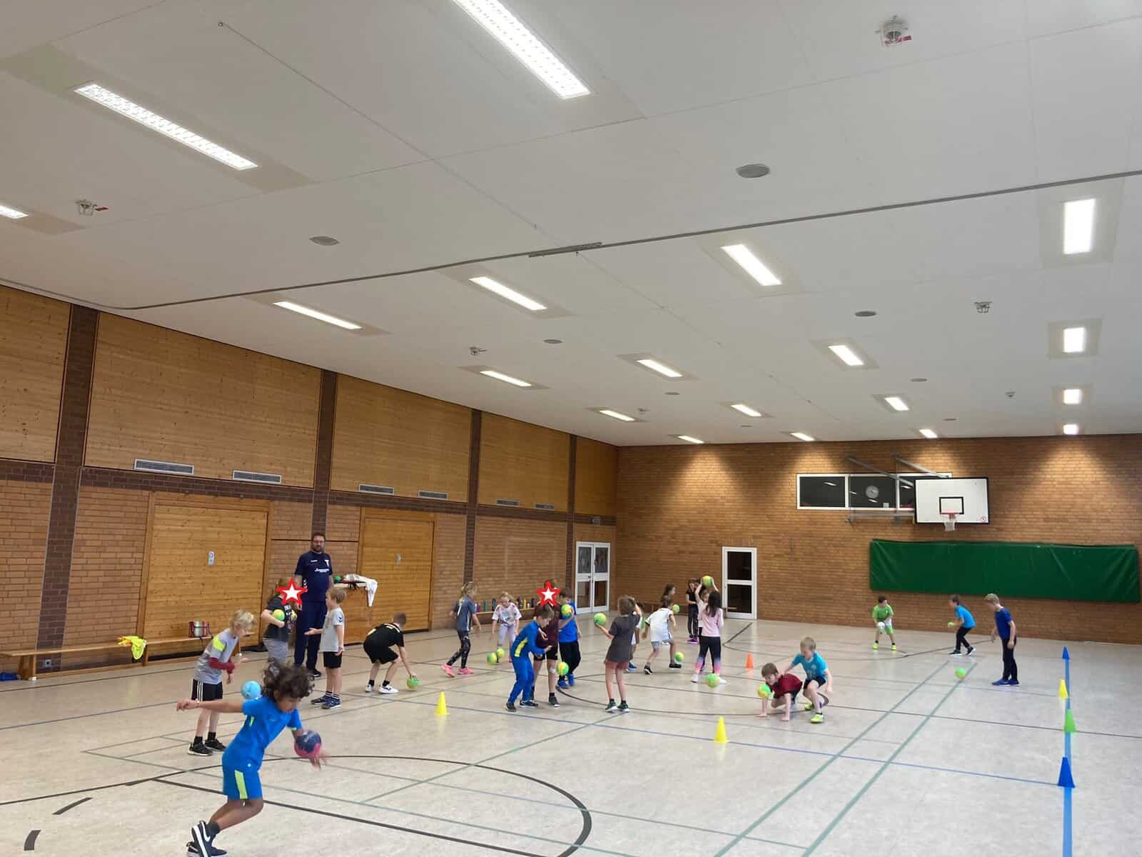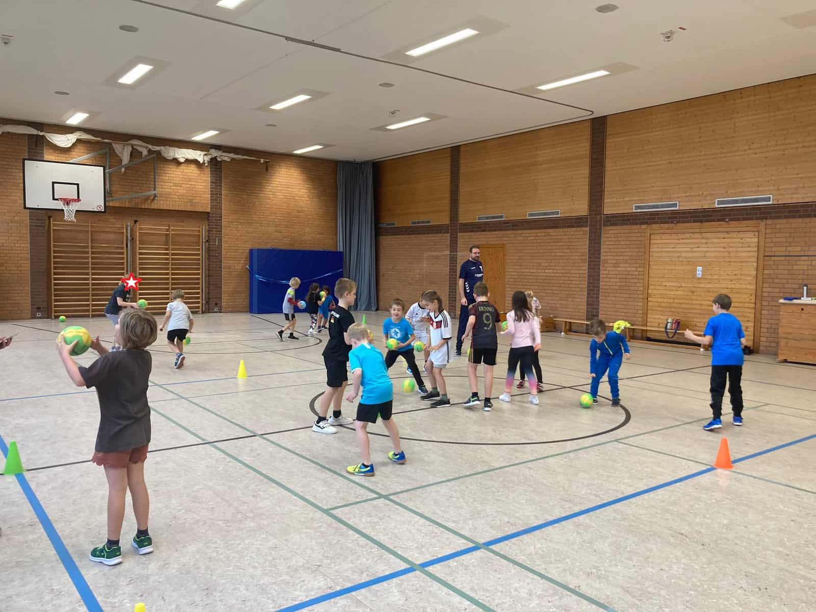 In einem Zeitraum von jeweils 90 Minuten (zwei Schulstunden) konnten die Erst- und Zweitklässler beim offiziellen Handball-Spielabzeichen des DHB – dem Hanniball-Pass – ihre persönlichen Fähigkeiten austesten und im Anschluss in verschiedenen Spielformen ihren Teamgeist unter Beweis stellen.