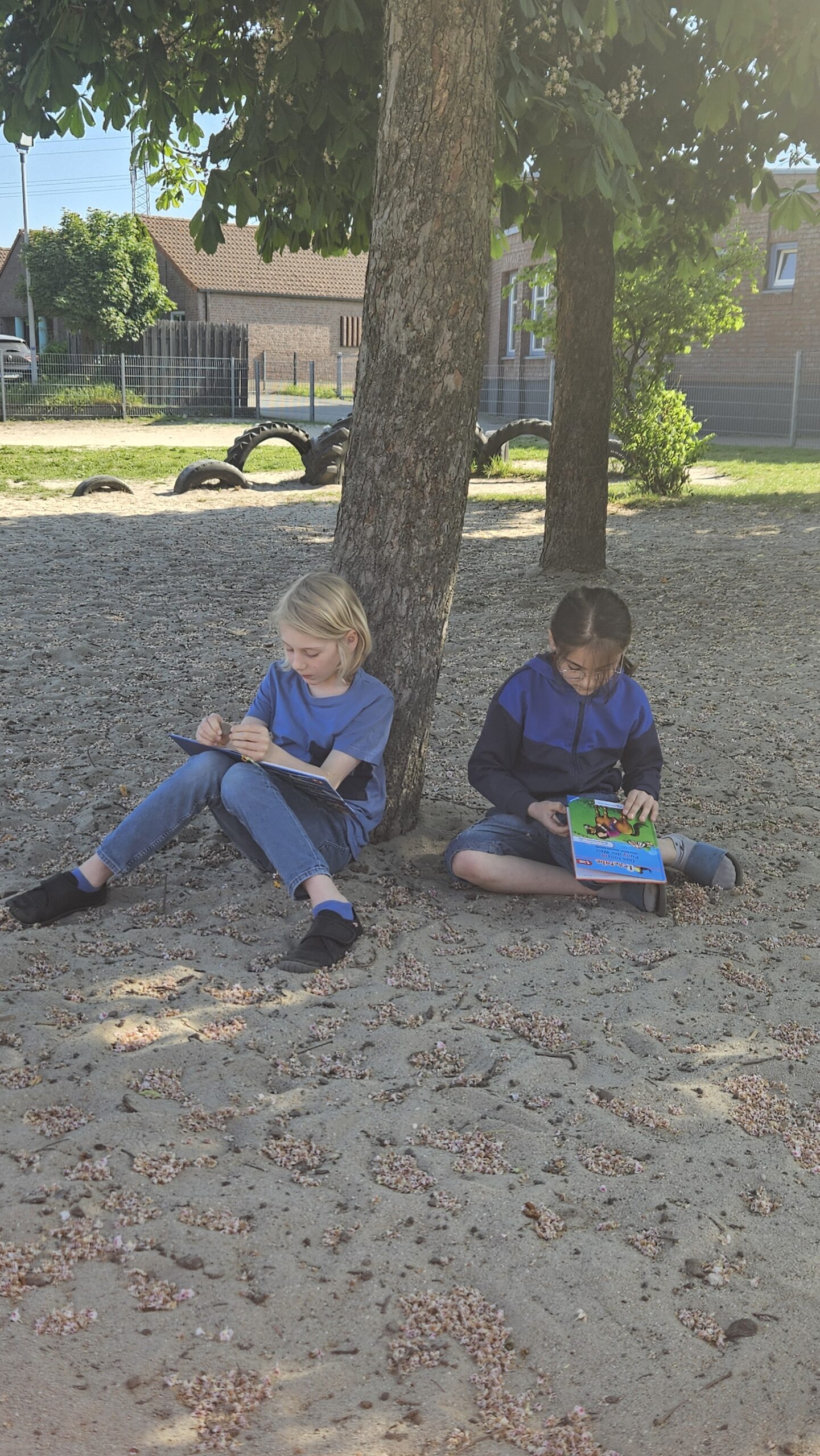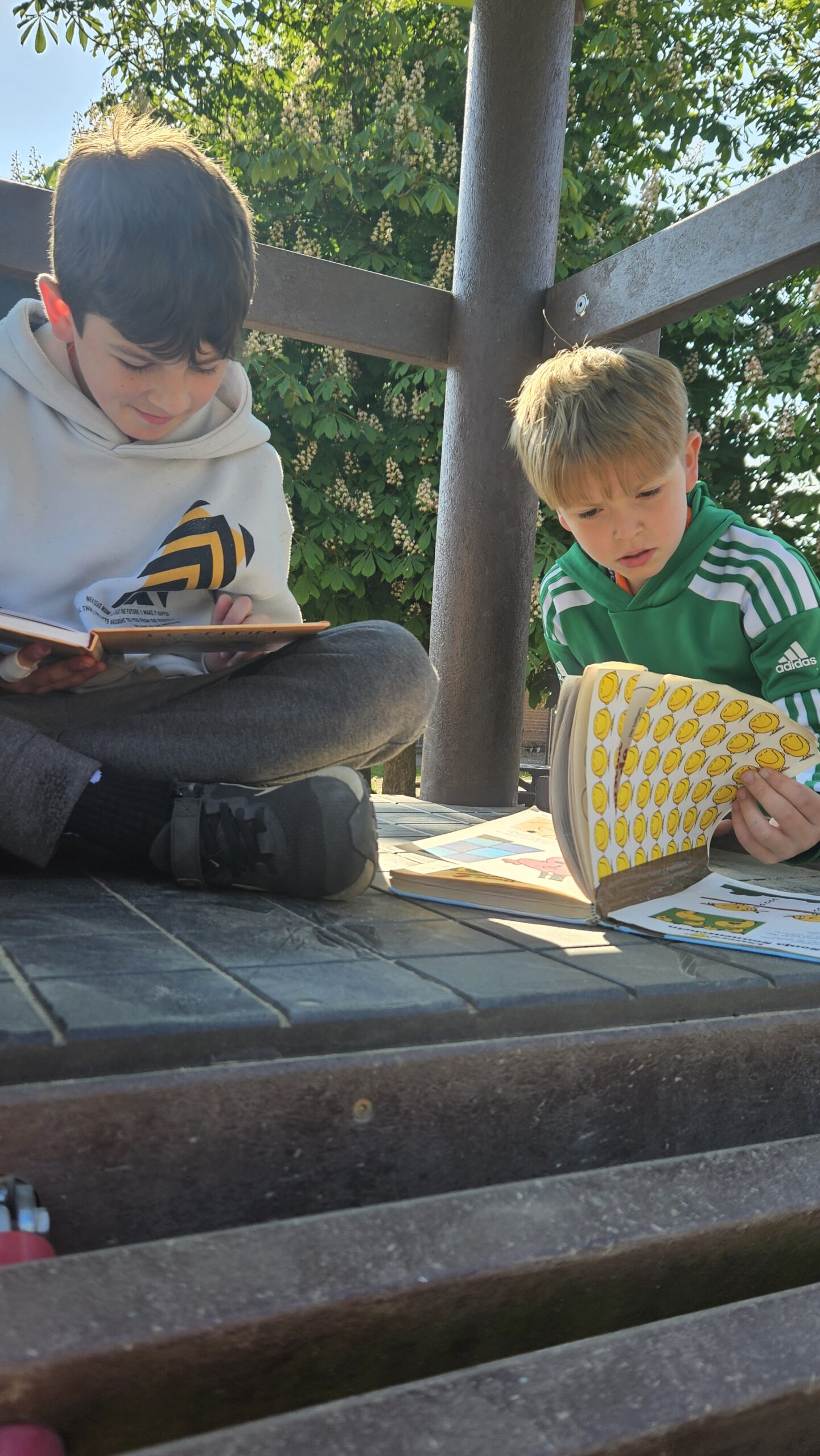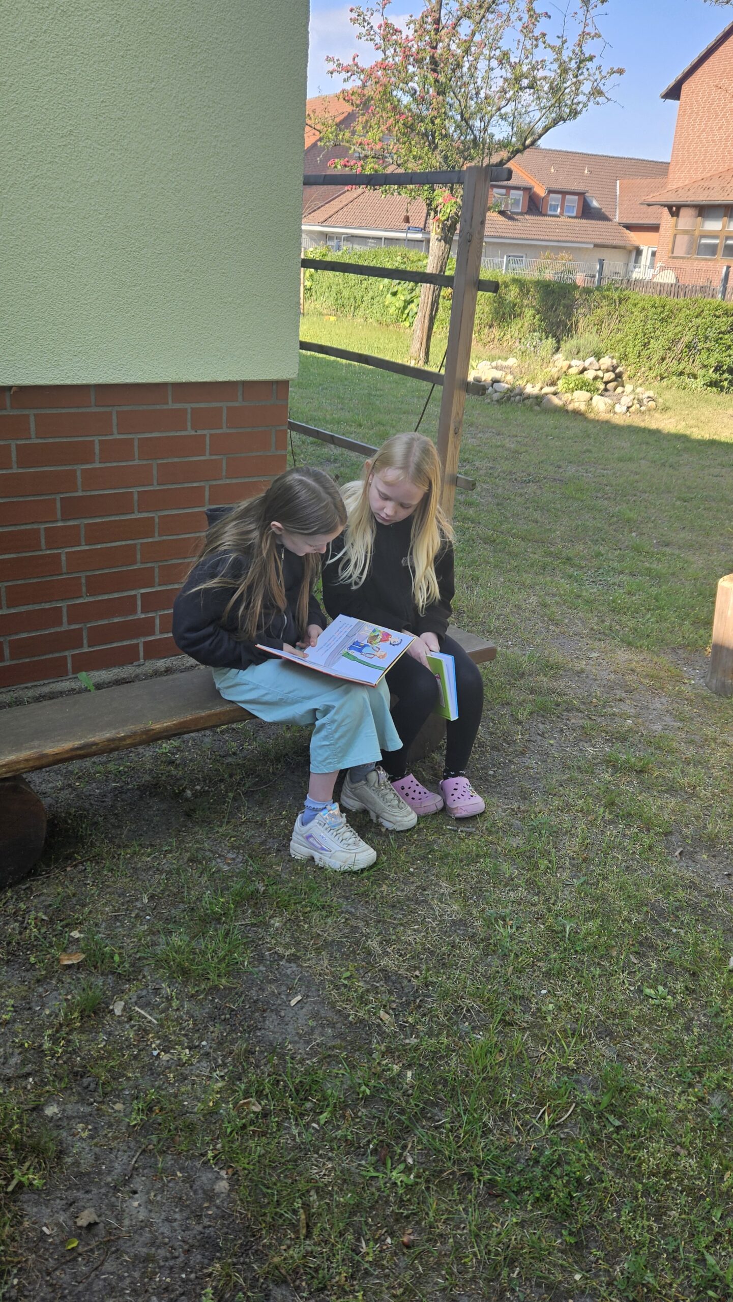 Klasse 3 genoss heute die Deutschstunde im Freien, bei Sonnenschein, in vollen Zügen. Gemeinsam mit einem Partner/einer Partnerin übten die Kinder das gegenseitige laute Vorlesen, um für ihre Paten aus dem Kindergarten einen schönen Lesevormittag gestalten zu können.