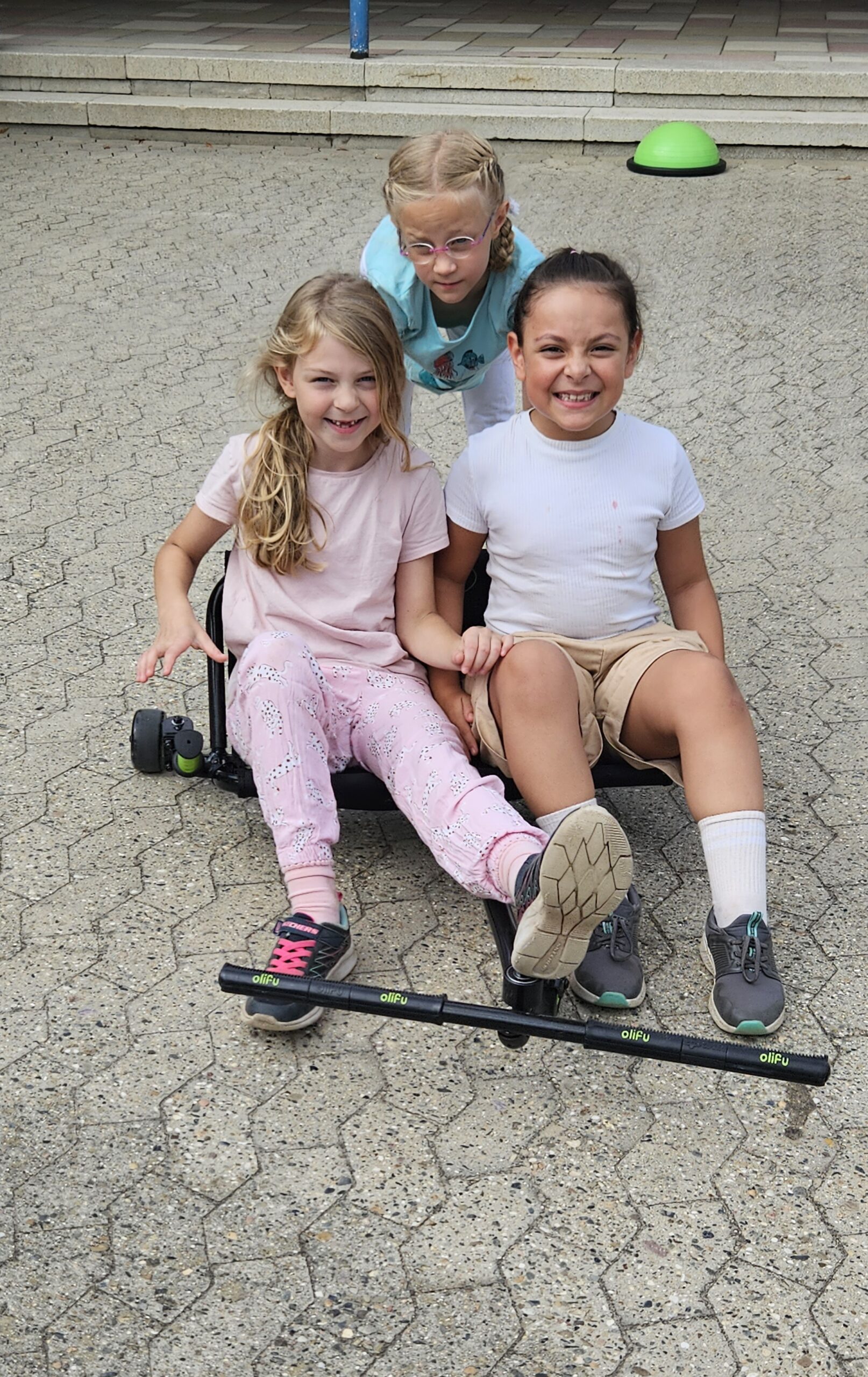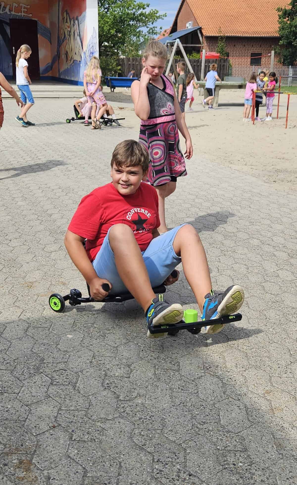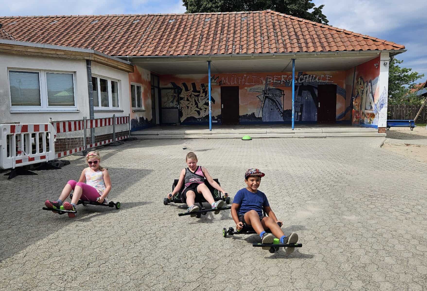 Auf der Suche nach tollen Bewegungs- und Kreativspielzeugen für eine bewegte Pause kam uns Herr Gloger der Firma „oliFu“ vor den Sommerferien besuchen und stellte uns die „olifu Racer Snake“-Fahrzeuge vor. Schon bei der ersten Probefahrt einiger Kinder auf unserem eher kleinen Schulhof war sofort klar – die brauchen wir! Der Förderverein erklärte sich sofort bereit vier Fahrzeuge für die Kinder anzuschaffen, darunter drei einzelne und ein doppeltes für gemeinsamen Fahrspaß. Dazu gab es noch ein Balancierbewegungskissen sowie zwei große Pakete „Bambula Steine“ aus Bambus für den Ganztag, mit denen die Kinder auch dreidimensional, mit Steckverbindungen bauen können.
