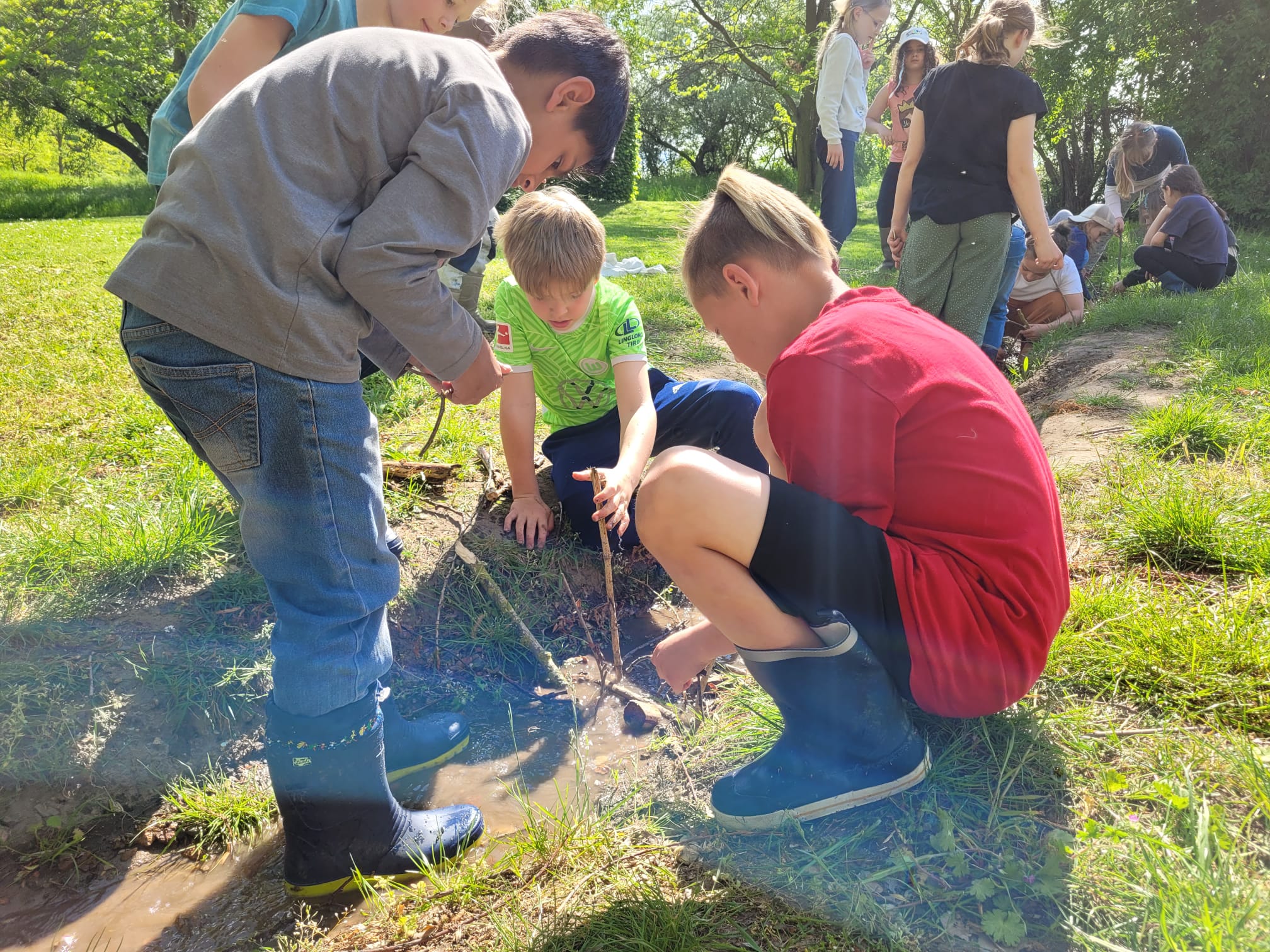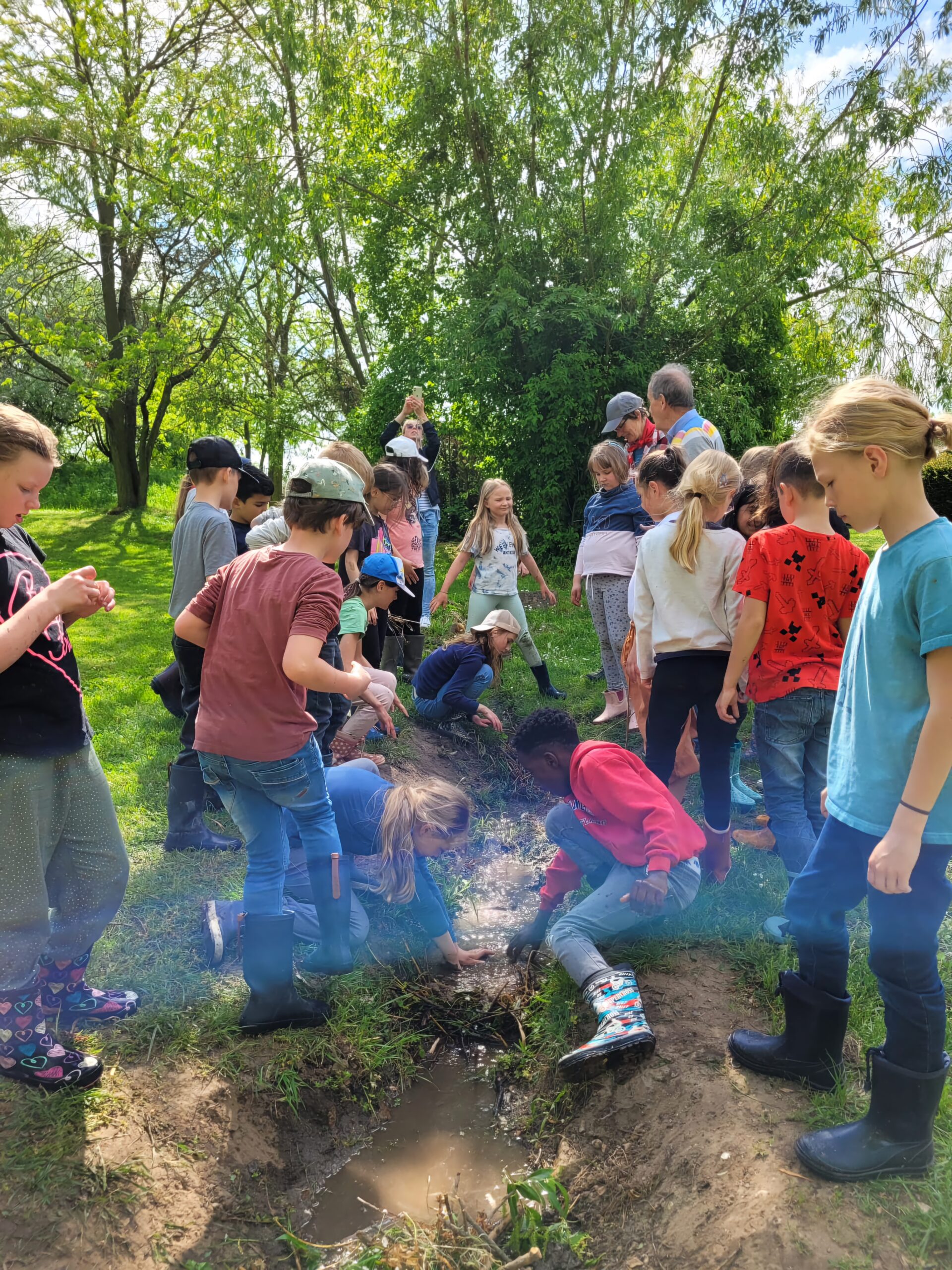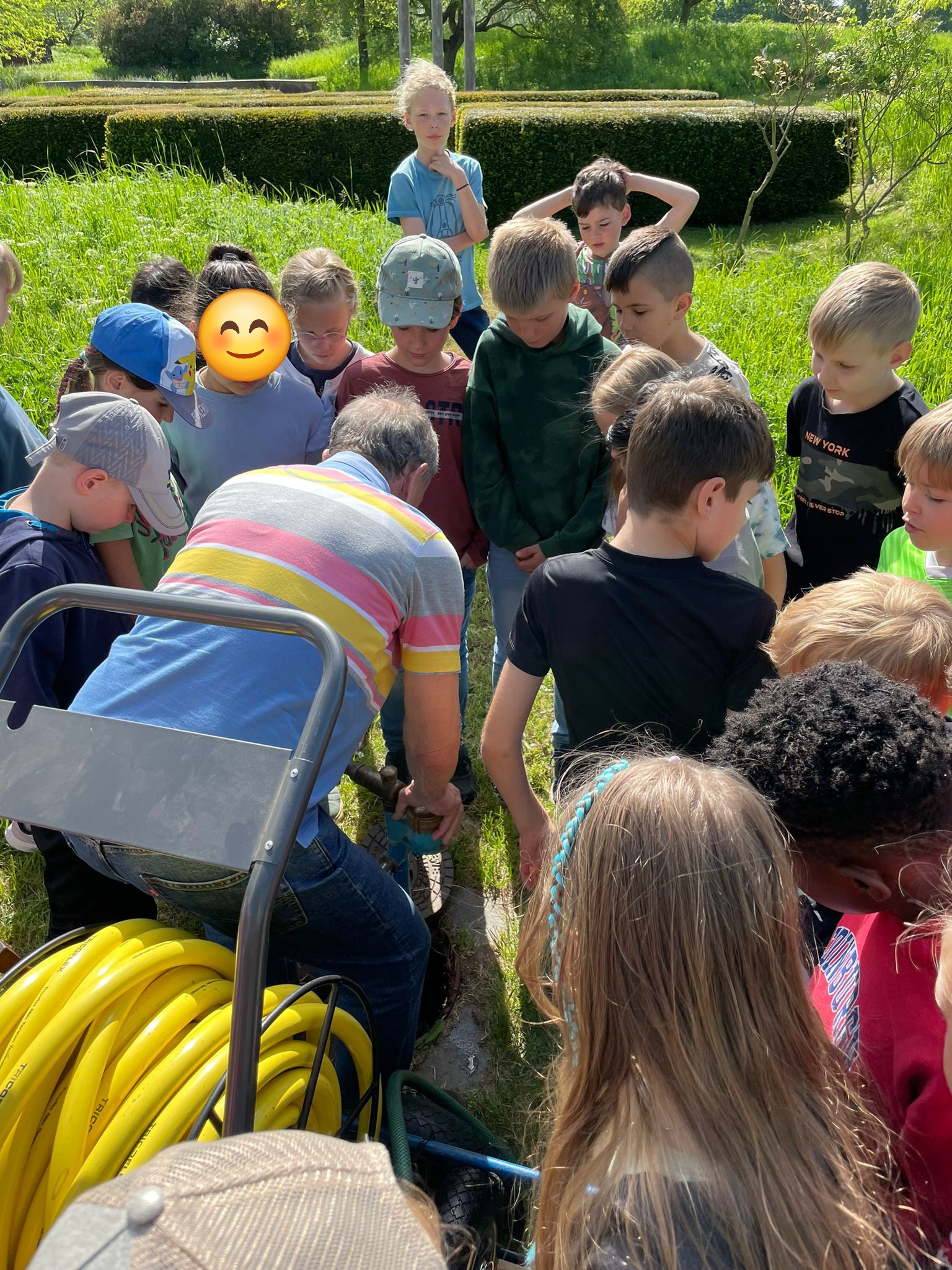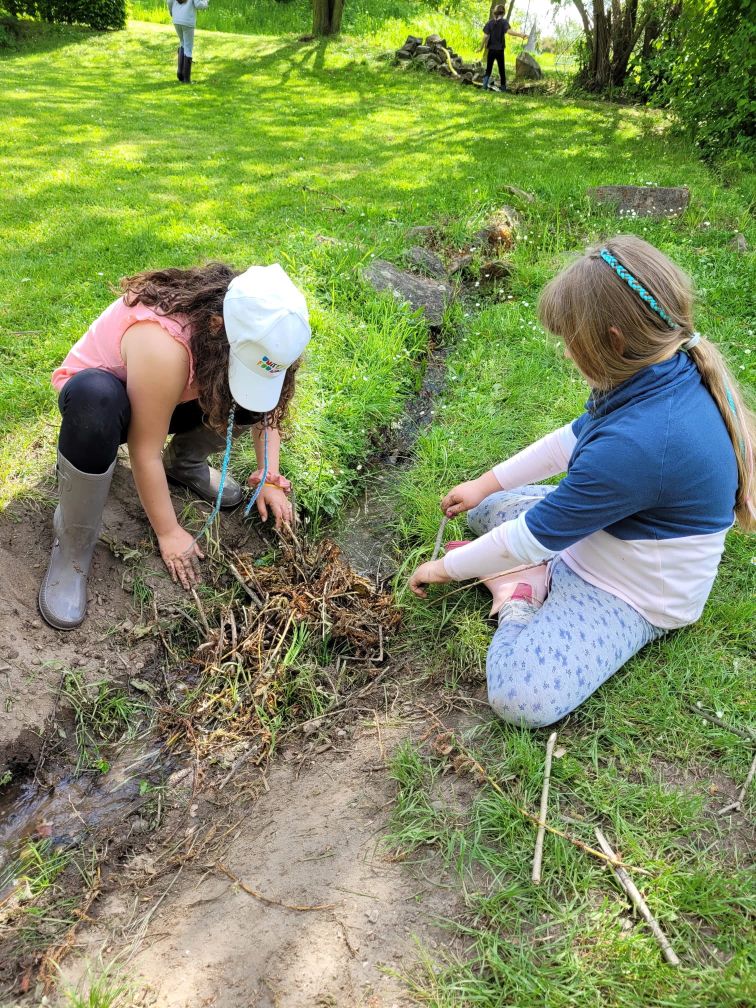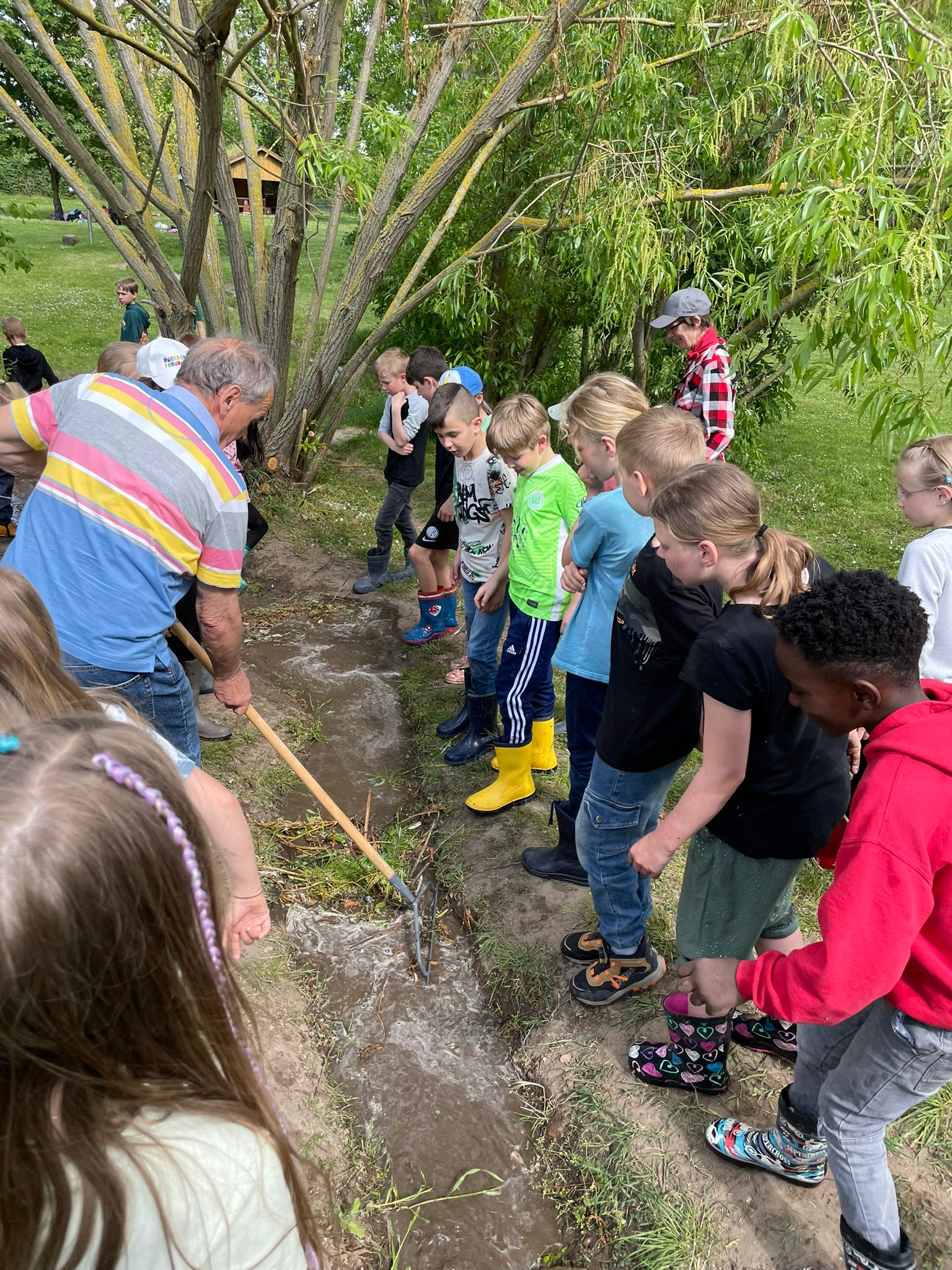Klasse 2 und 3 waren derweil eifrig dabei, sich mit dem Biber und seinem Lebensraum zu beschäftigen: „Biberopa Bernd“ erzählte den Kindern einiges über den Körper des Bibers, seine Lebensweise und den speziellen Aufbau seiner Burg. Danach wurde mit einem Feuerwehrschlauch eine künstliche Elbe erzeugt, in deren Verlauf die Kinder, jetzt zu einzelnen Bibergruppen verwandelt, einen Damm für ihre Burg bauen sollten. Mit Hilfe von kleinen Stöcken, Schlamm, Gras und anderen Naturmaterialien haben alle Gruppen gute Dämme gebaut. Am Ende kam dann aber leider die große „Flut“, die alle Dämme bis in die Nordsee gespült hatte. Anschließend konnten die Kinder noch den großen Rutschenturm, den Rutschenvulkan und die großen Hüpfkissen austesten.