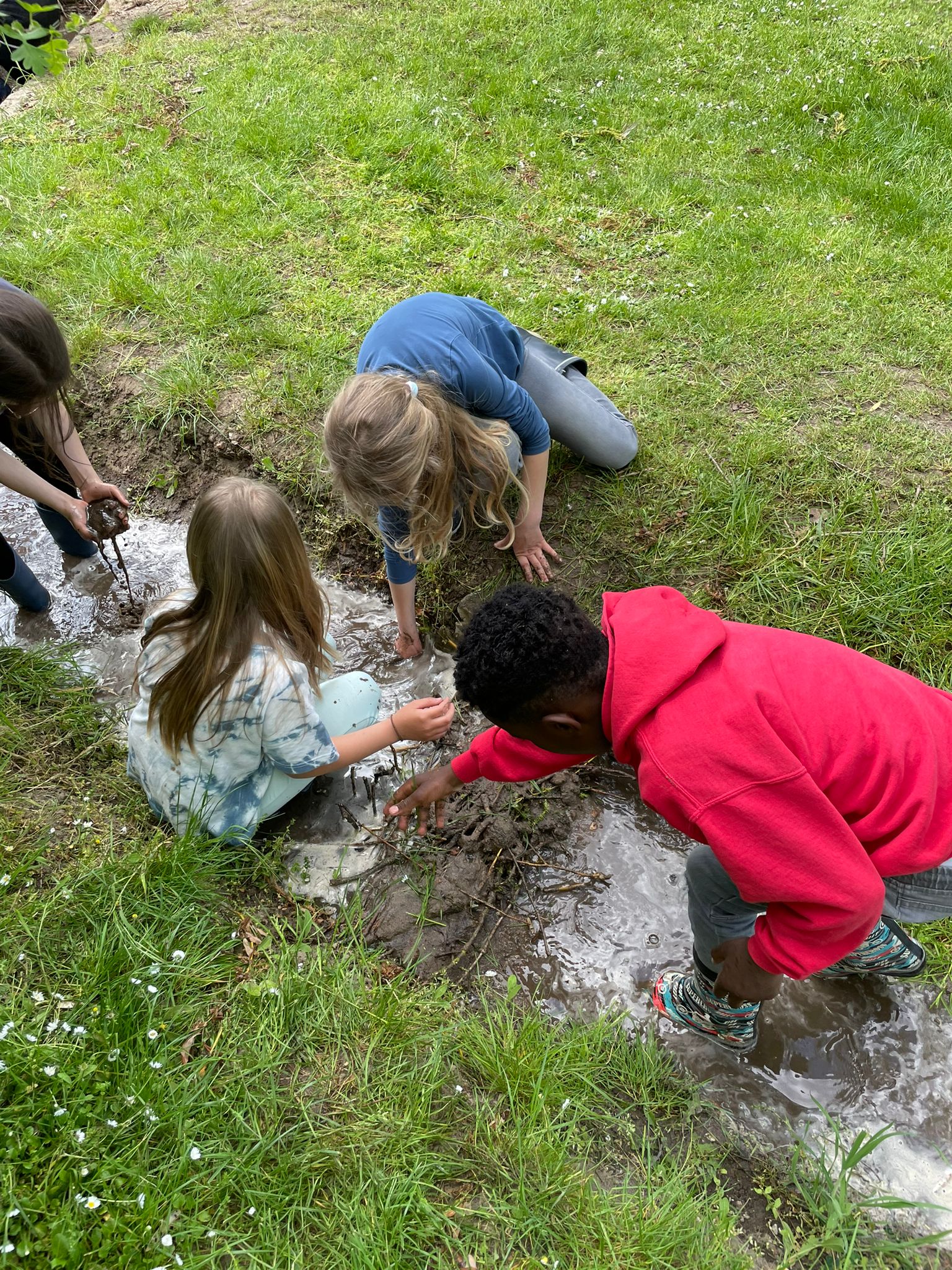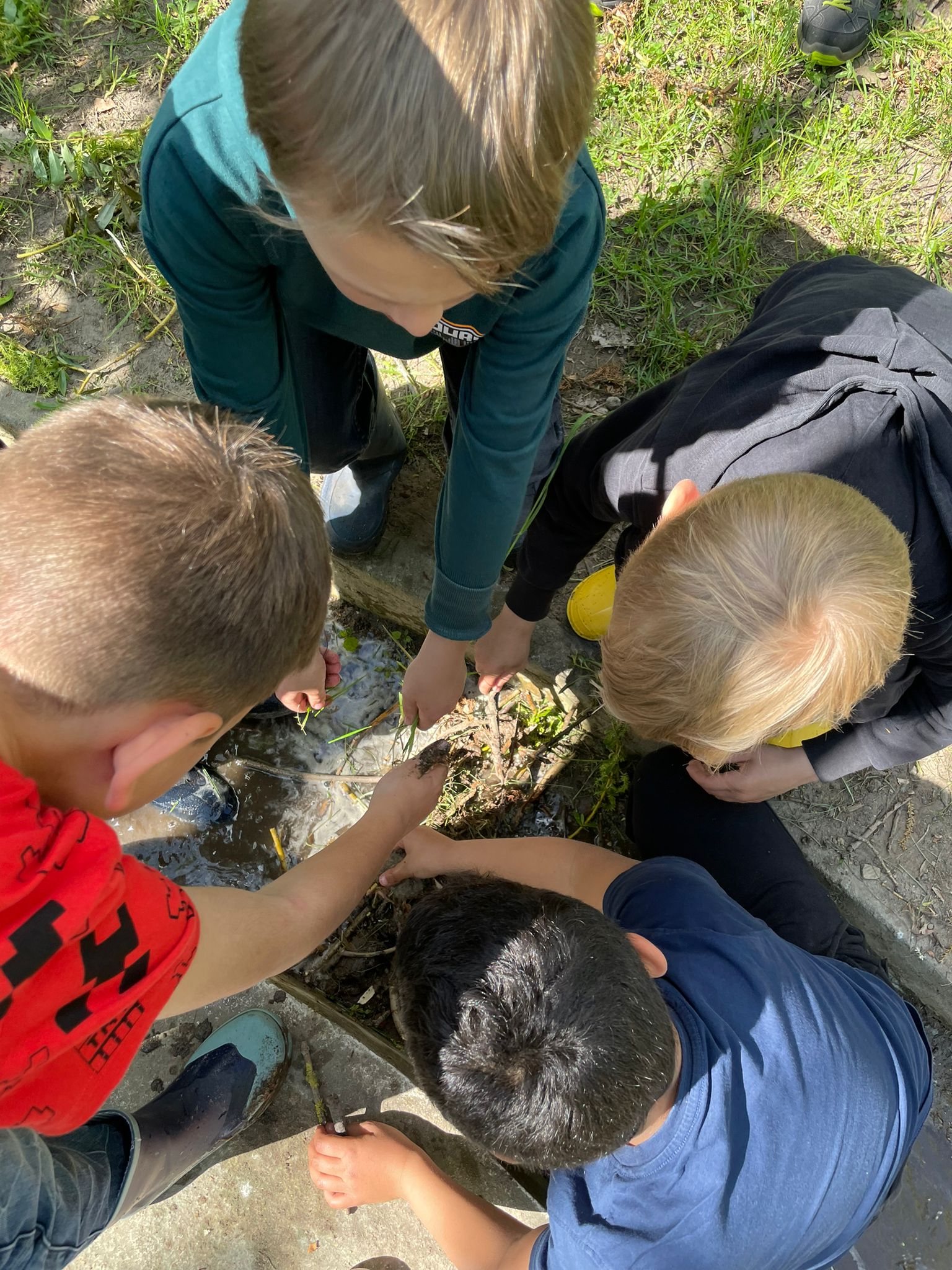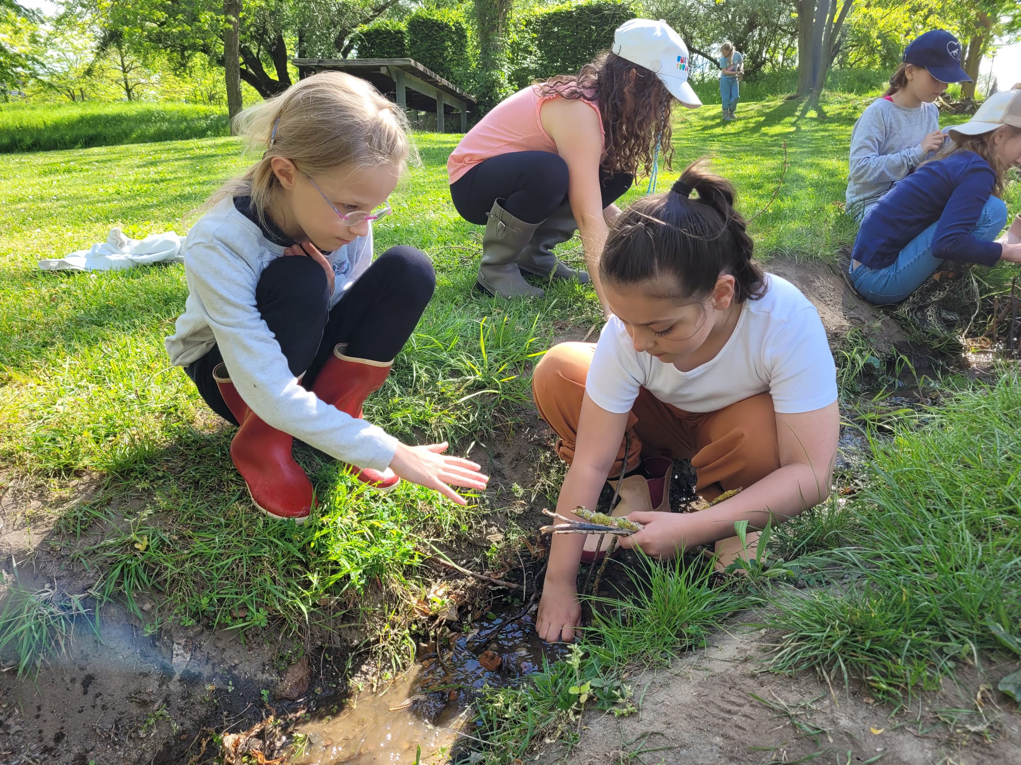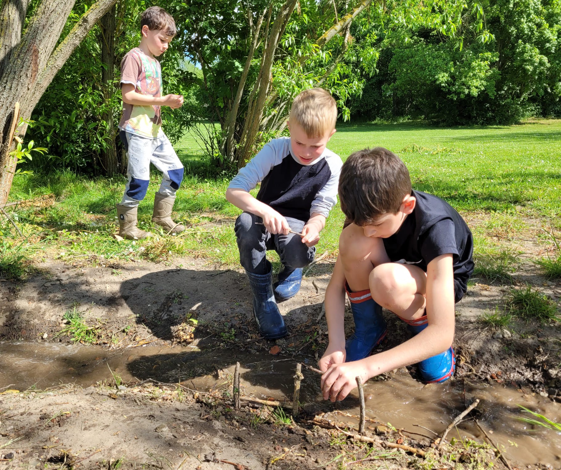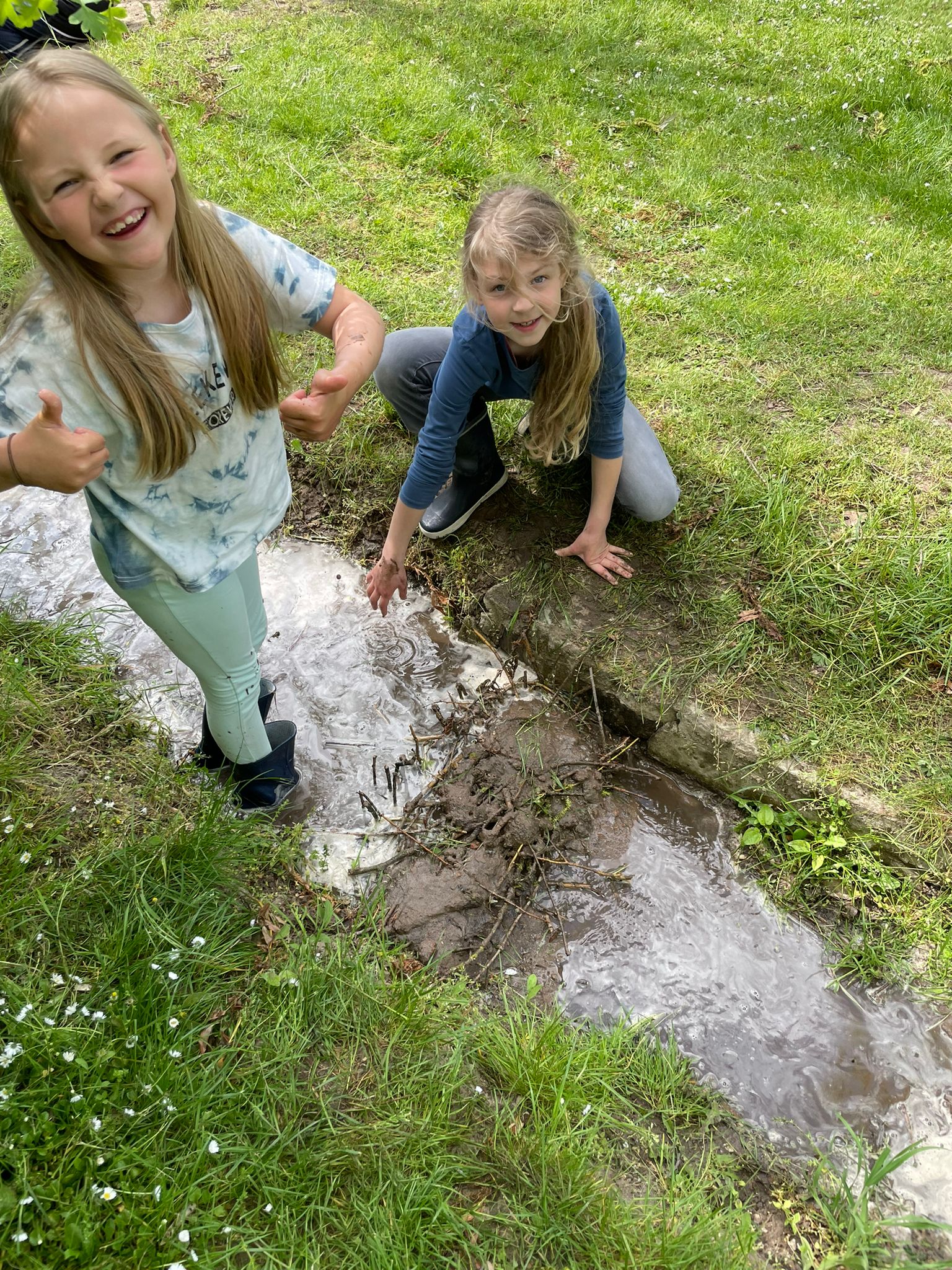 Klasse 2 und 3 waren derweil eifrig dabei, sich mit dem Biber und seinem Lebensraum zu beschäftigen: „Biberopa Bernd“ erzählte den Kindern einiges über den Körper des Bibers, seine Lebensweise und den speziellen Aufbau seiner Burg. Danach wurde mit einem Feuerwehrschlauch eine künstliche Elbe erzeugt, in deren Verlauf die Kinder, jetzt zu einzelnen Bibergruppen verwandelt, einen Damm für ihre Burg bauen sollten. Mit Hilfe von kleinen Stöcken, Schlamm, Gras und anderen Naturmaterialien haben alle Gruppen gute Dämme gebaut. Am Ende kam dann aber leider die große „Flut“, die alle Dämme bis in die Nordsee gespült hatte. Anschließend konnten die Kinder noch den großen Rutschenturm, den Rutschenvulkan und die großen Hüpfkissen austesten.