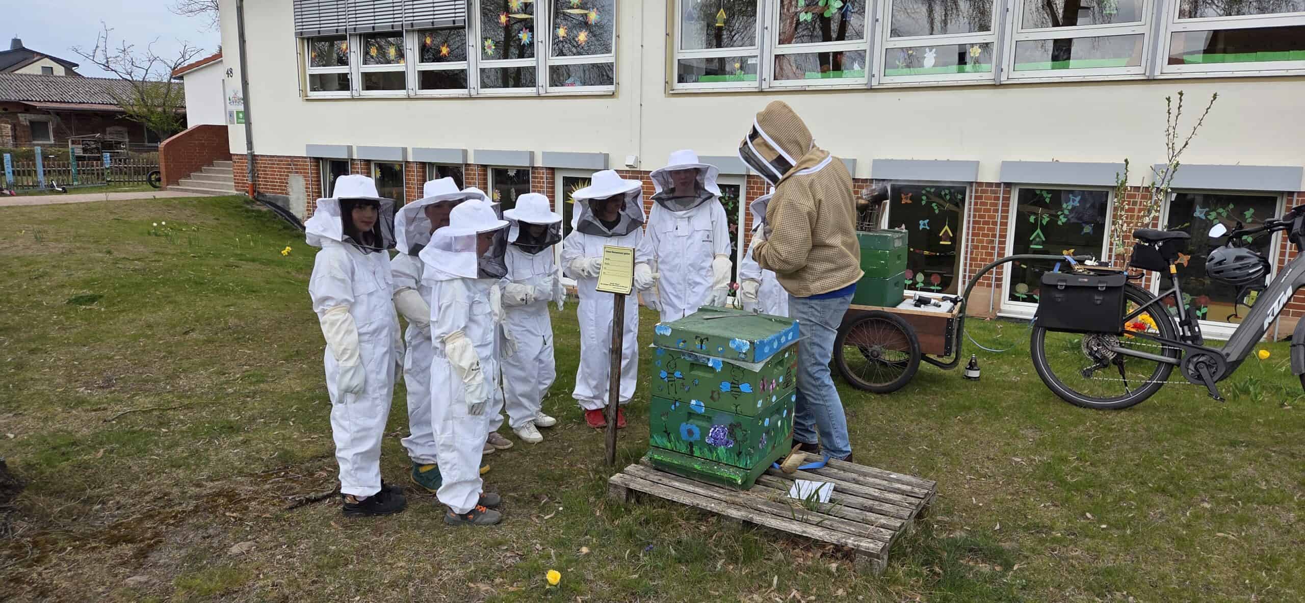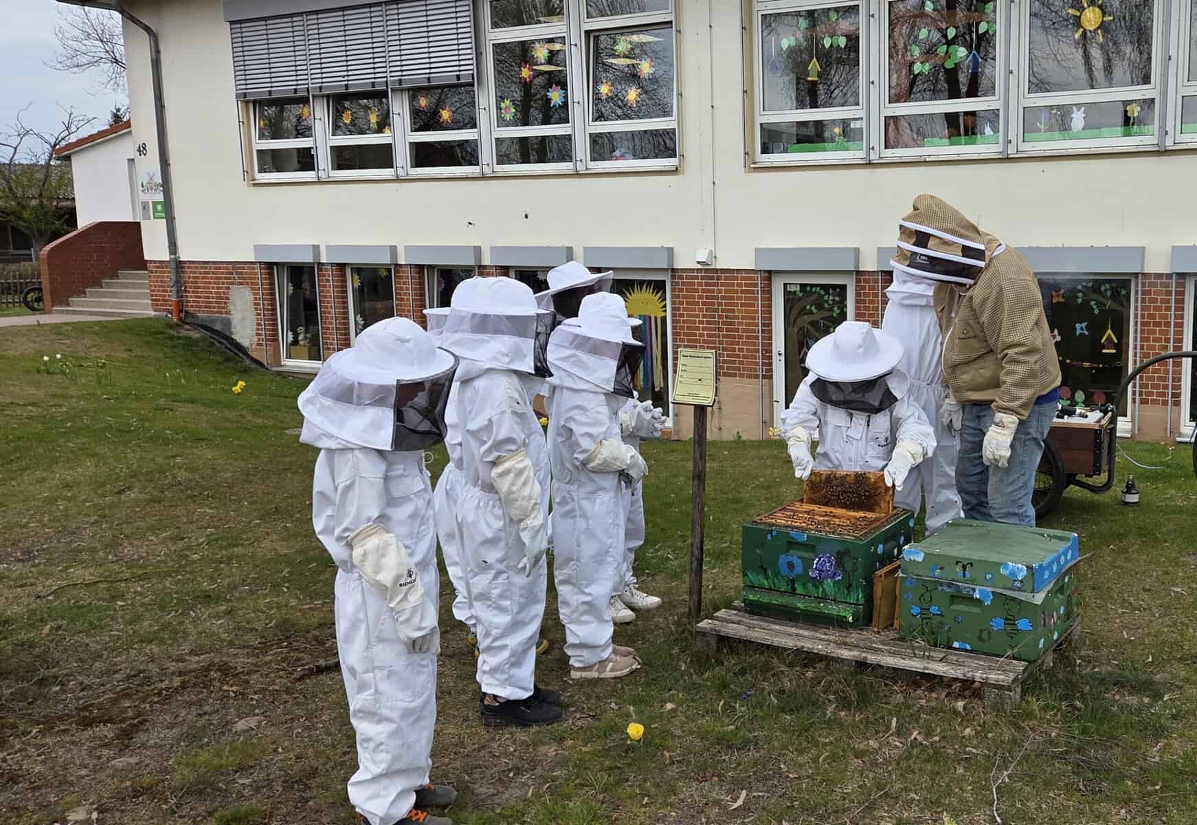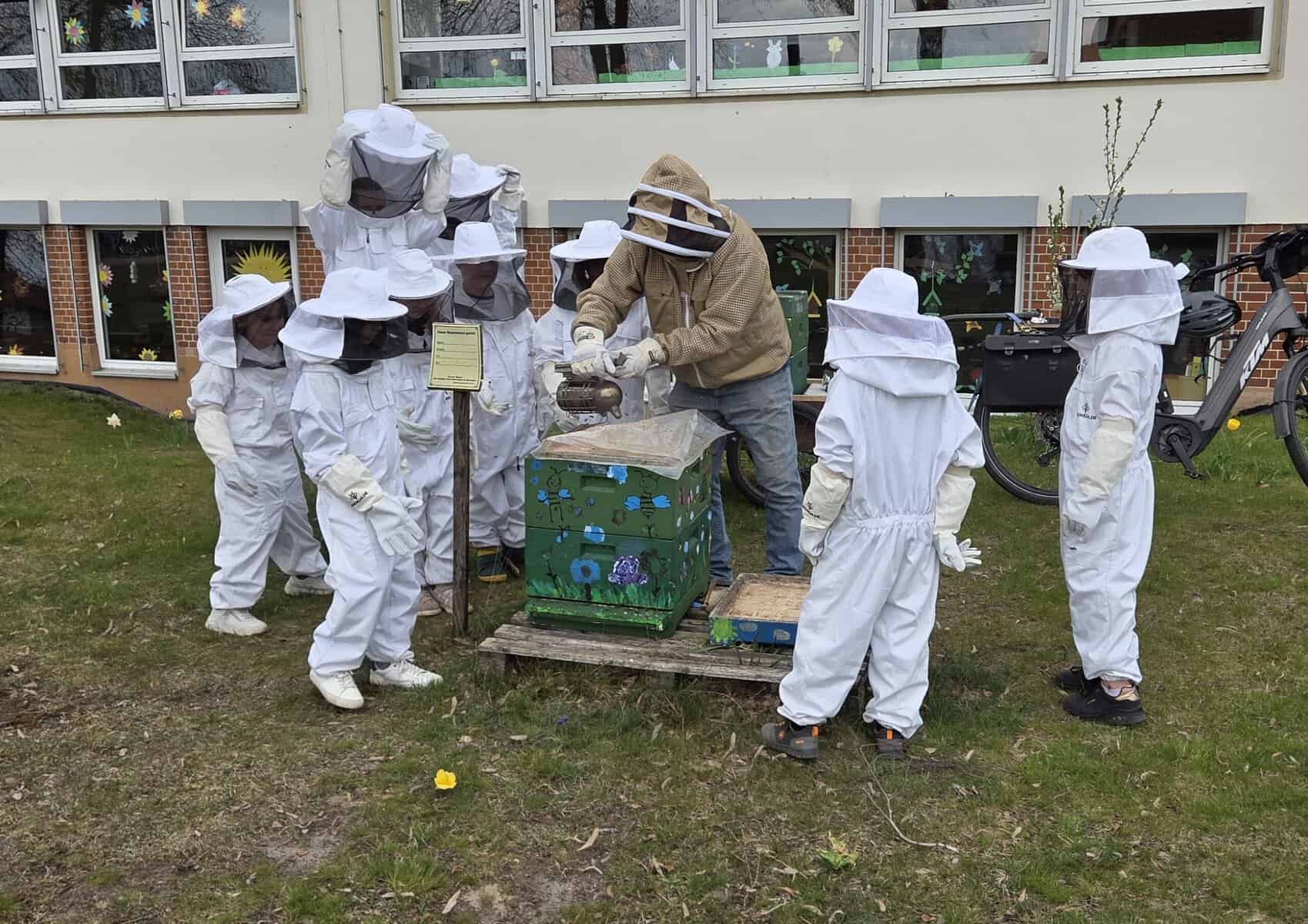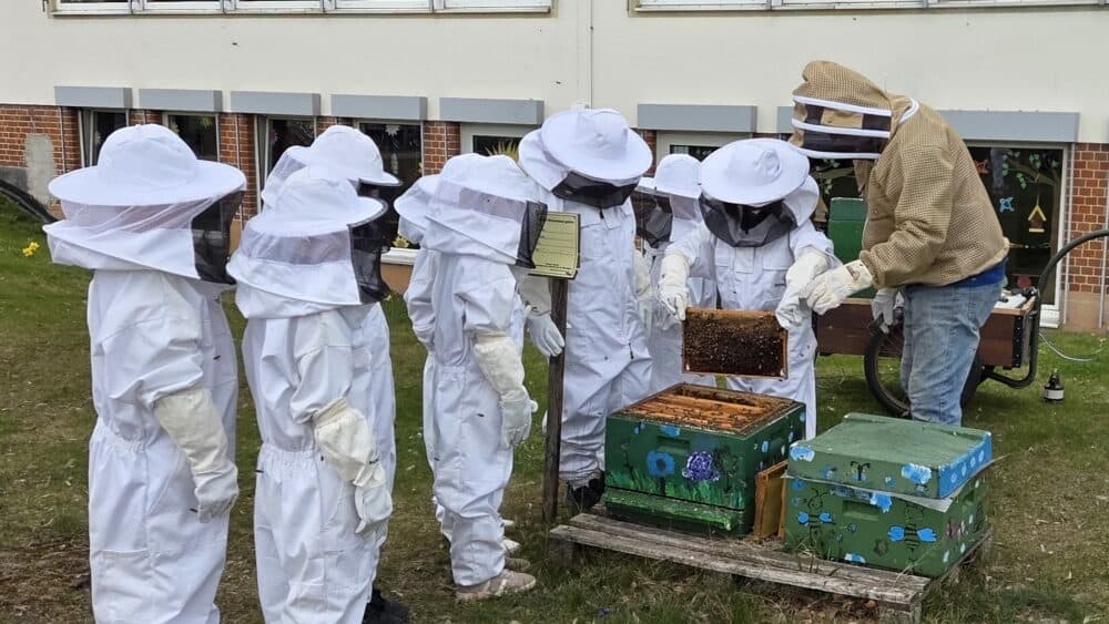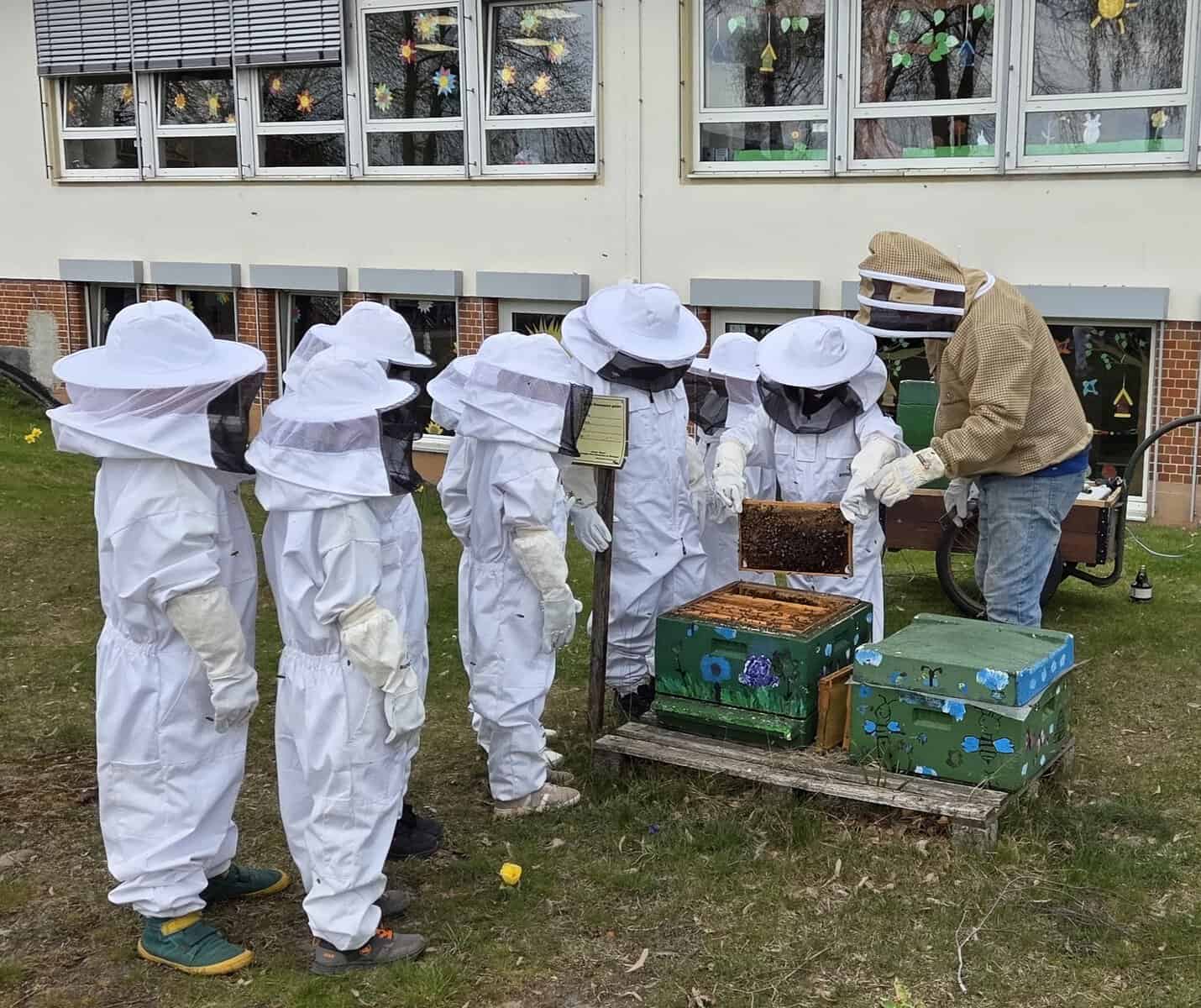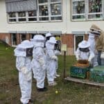 Unsere Kinder der Natur-AG sind ebenfalls schon fleißig im Einsatz. Bei der wöchentlichen Weiselzellkontrolle bereiten sie sich Schritt für Schritt auf die erste Honigernte vor. Wenn ihr also kleine Menschen in großen Schutzanzügen durch den Schulgarten laufen seht, handelt es sich nicht um die nächste Artemis-II-Mission, sondern um unsere kleinen und großen Schulimker:innen. 🐝