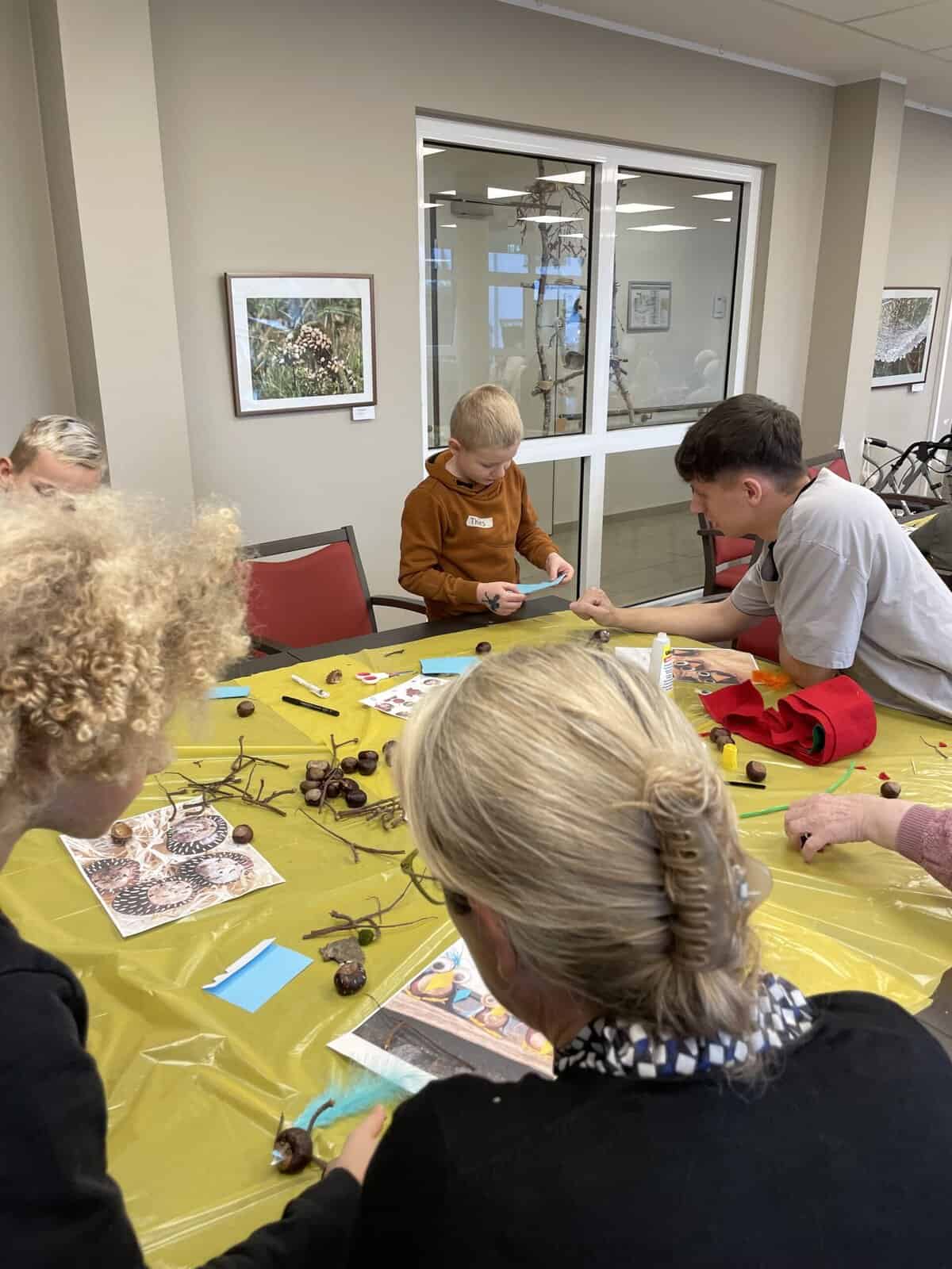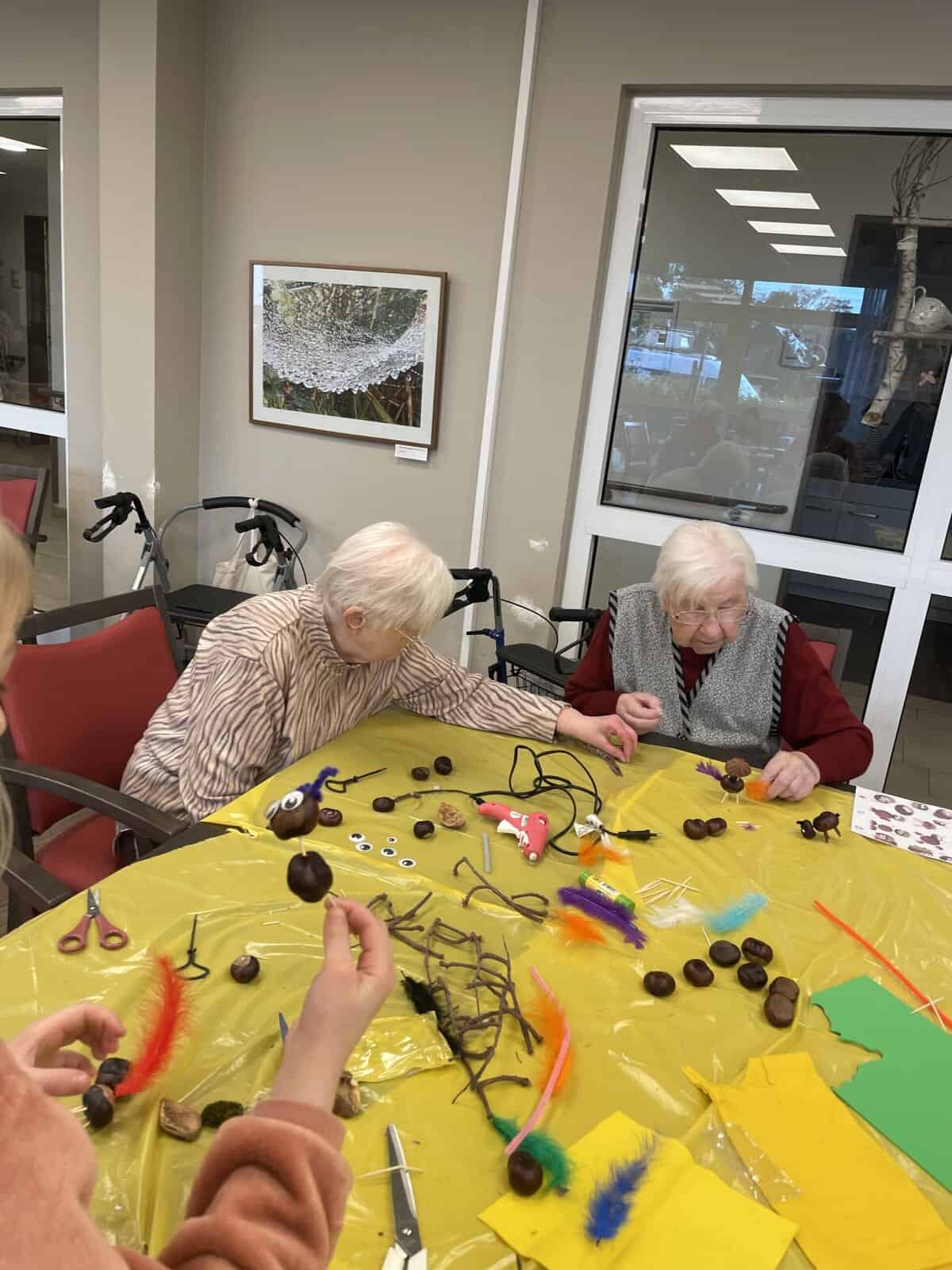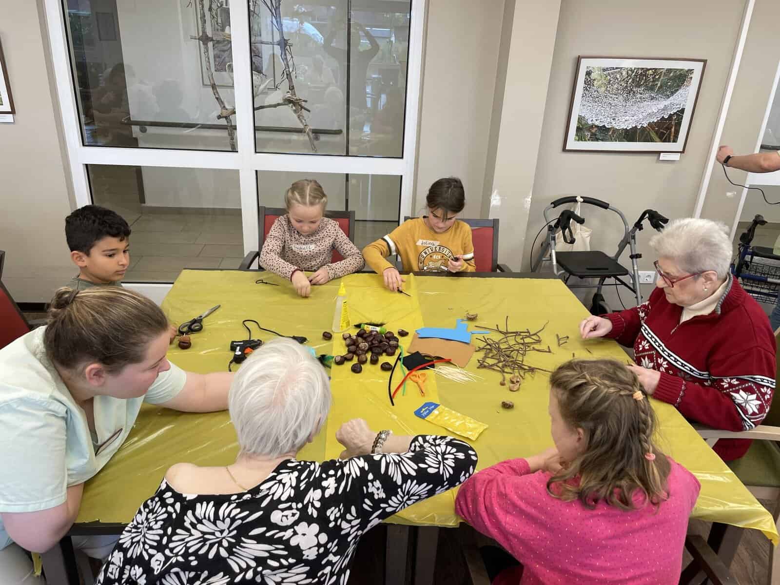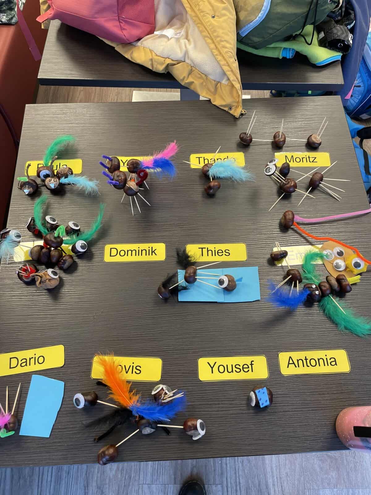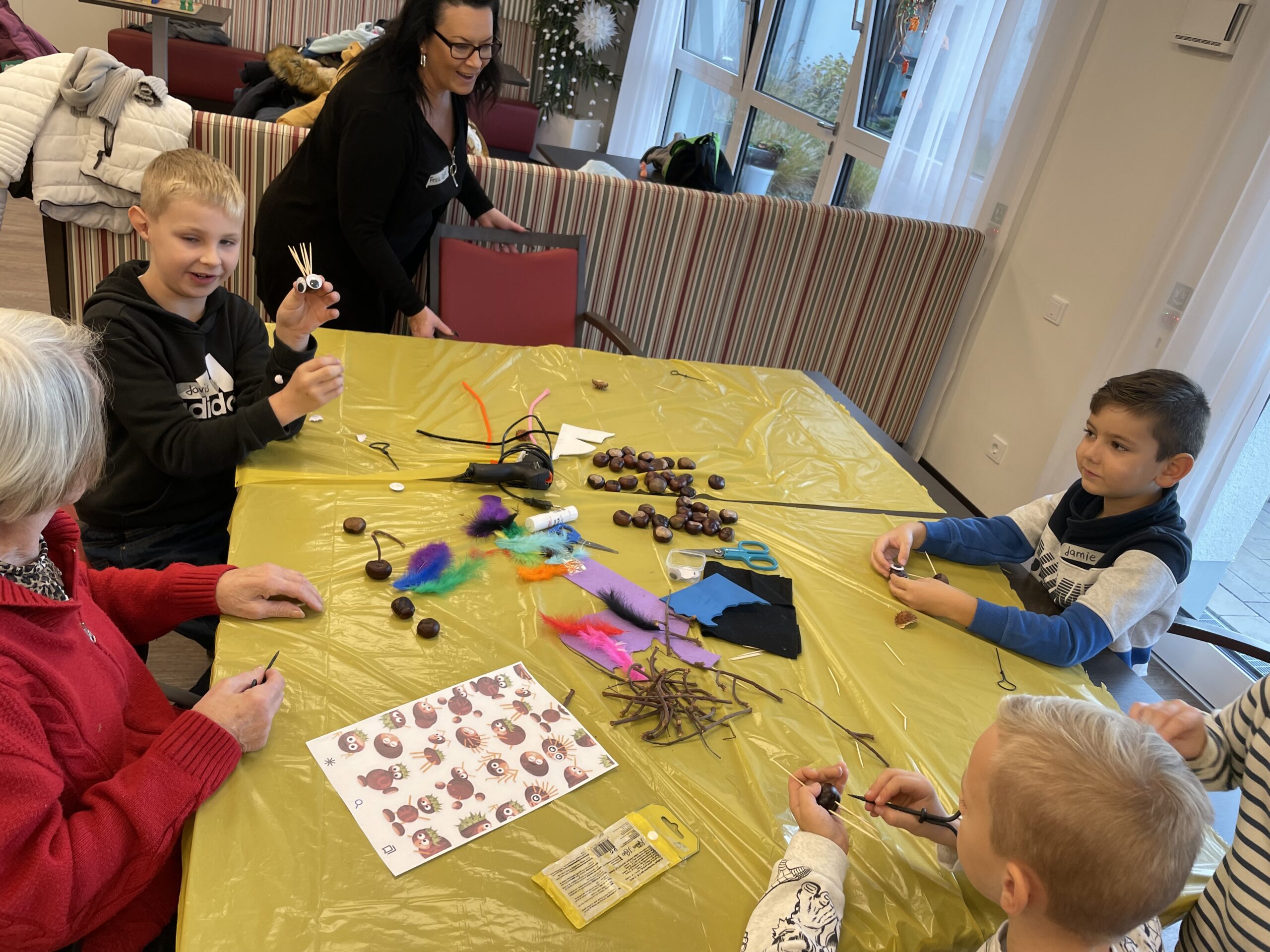Im Empatica angekommen wurden wir freundlich von den einigen Heimbewohnern sowie zwei Pflegekräften und zwei Auszubildenden empfangen. Die 19 Kinder der Klasse durften sich an die bereits vorbereiteten Basteltische verteilen und gemeinsam wurde nach einer kurzen Einweisung nach Herzenslust gebastelt. Die bereitgelegten Anregungen fanden nur wenig Beachtung, denn die Kinder hatten allerlei Ideen, was sie aus den Kastanien, Federn, Wackelaugen, Zahnstochern und Pfeifenputzern so alles herstellen konnten. Einige Heimbewohner bastelten eifrig mit, andere erfreuten sich einfach an dem Trubel und schauten zu. Zwischen einigen Kindern und Bewohnern kam es zu einem persönlichen Austausch. Am Ende verschenkten sogar einige Kinder ihre gebastelten Kunstwerke.