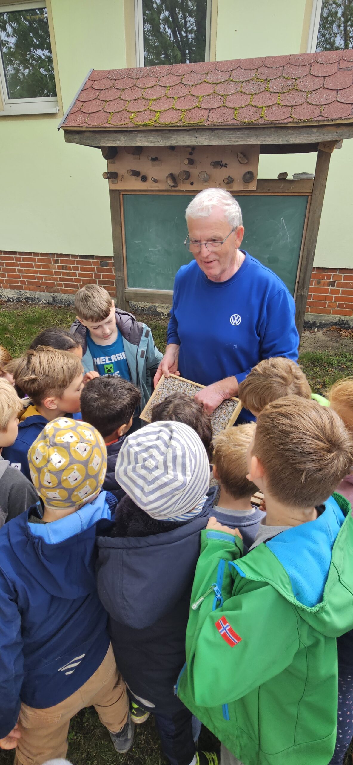 Unsere Zweitklässler hatten kürzlich ganz besonderen Besuch: Imker Ulli Binnewies war zu Gast an unserer Schule und nahm die Kinder mit auf eine faszinierende Reise in das Leben der Honigbienen. Mit viel Geduld und Fachwissen erklärte er, welche Aufgaben ein Imker hat, wie es in einem Bienenstock zugeht und wie aus Nektar schließlich leckerer Honig wird – bis er im Glas auf dem Frühstückstisch landet.