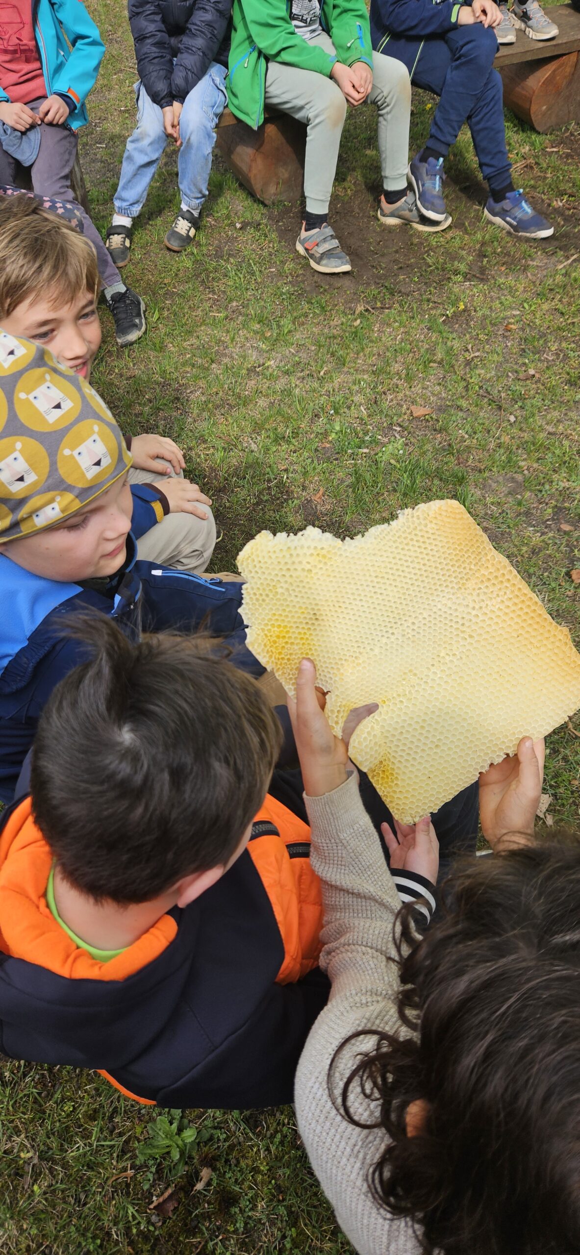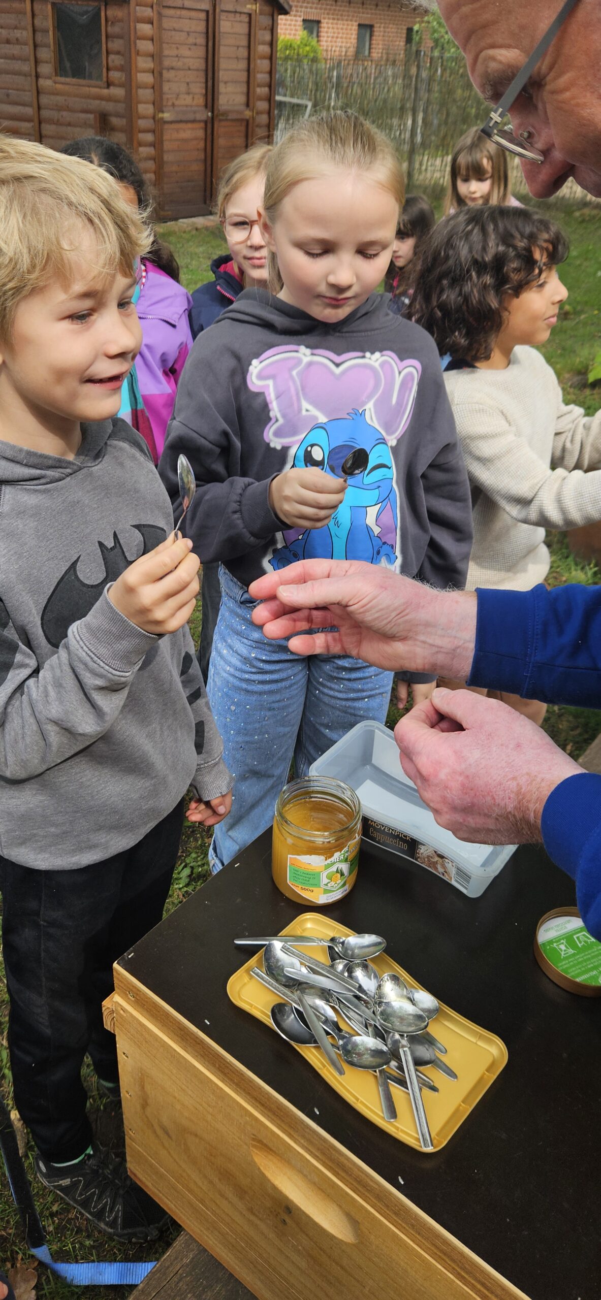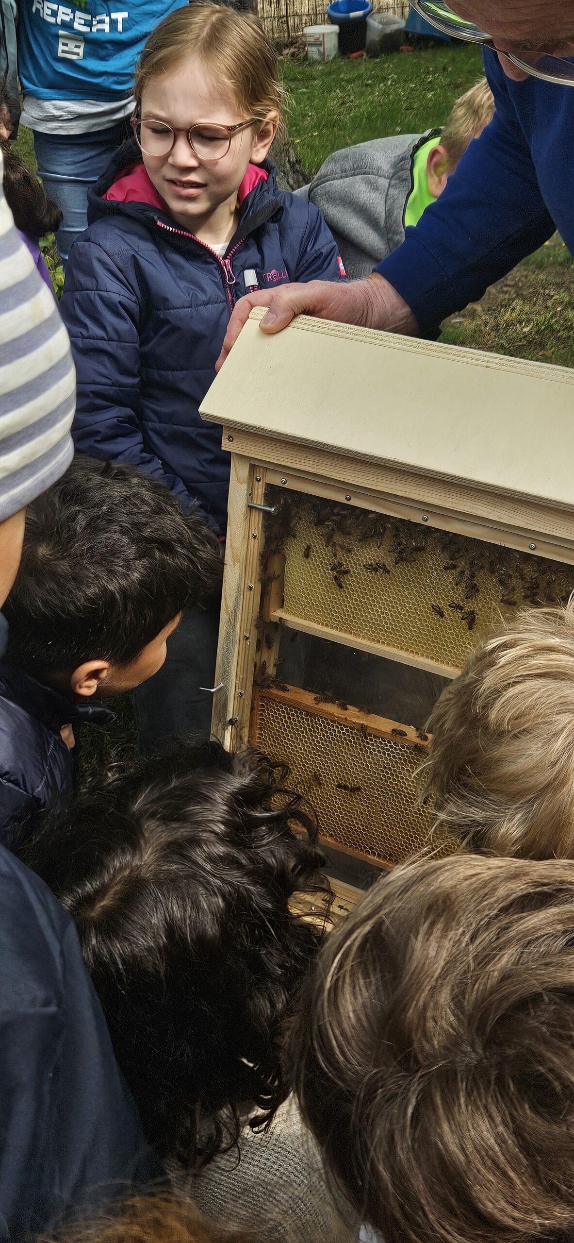 Besonders spannend fanden die Kinder die Erklärung zur regelmäßigen 9-tägigen Kontrolle der sogenannten Weiselzellen. Diese Kontrolle ist wichtig, damit keine zweite Bienenkönigin heranwächst – denn dann würde ein Teil des Bienenvolkes mit der neuen Königin ausschwärmen und den Stock verlassen. Aktuell befinden sich schon 12kg Honig in der Beute unserer Schulbienen und wir freuen uns auf das nächste Honigschleudern.