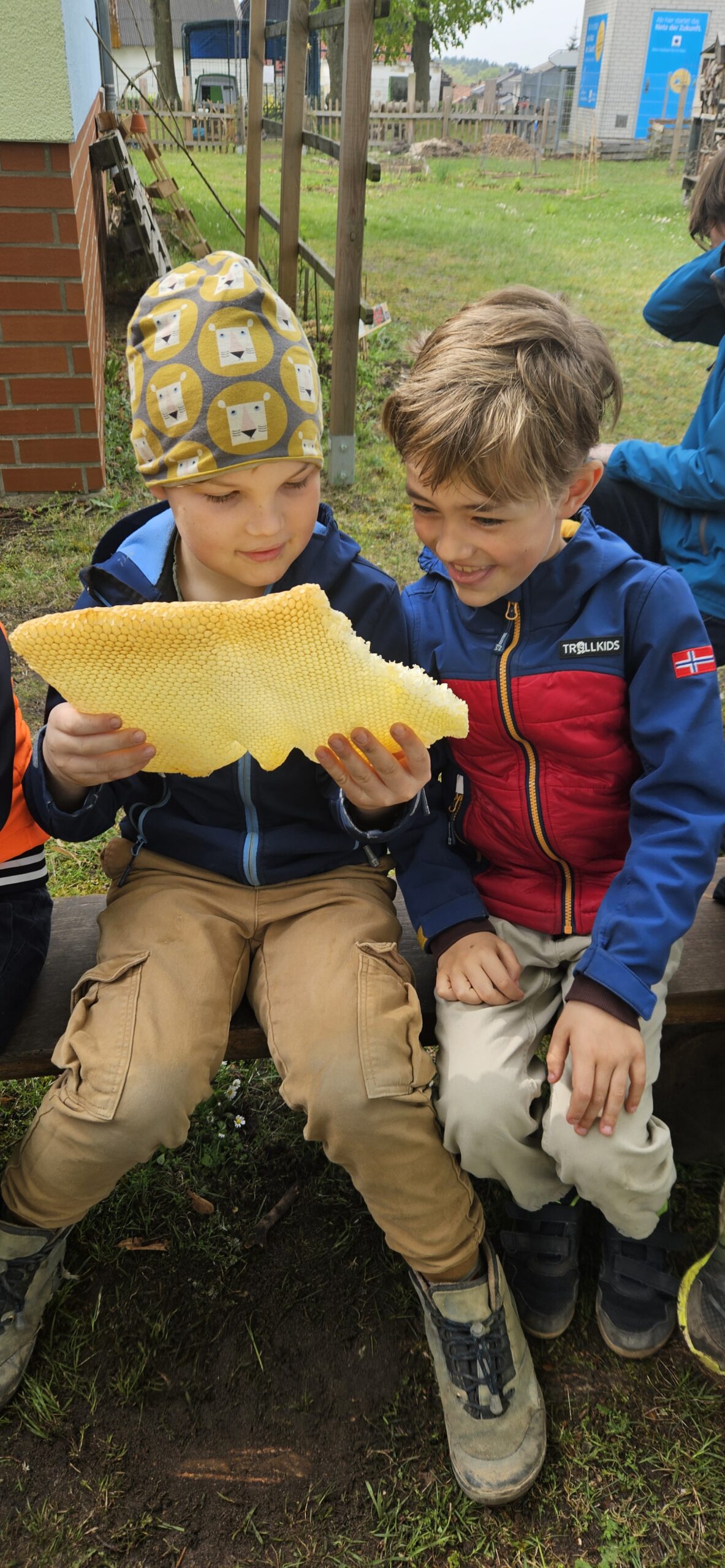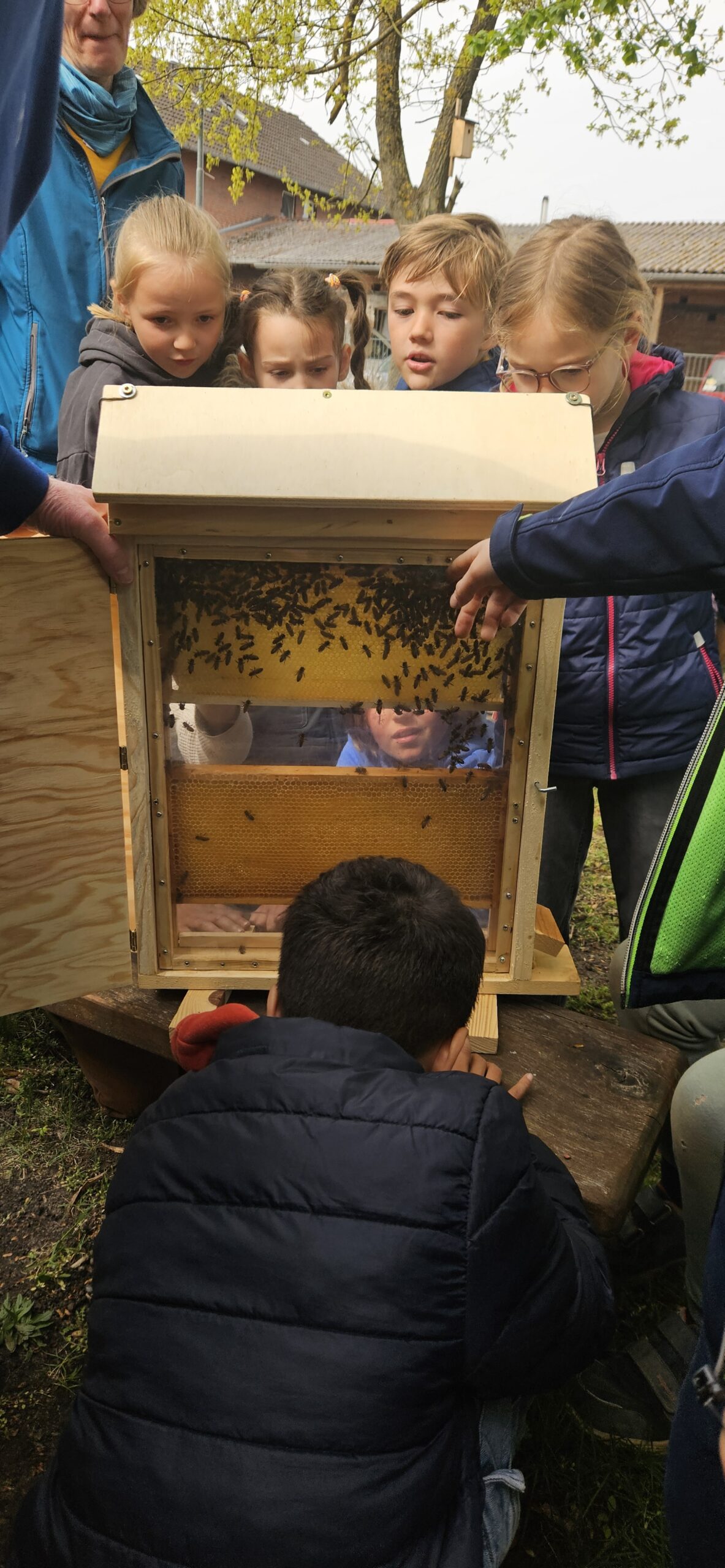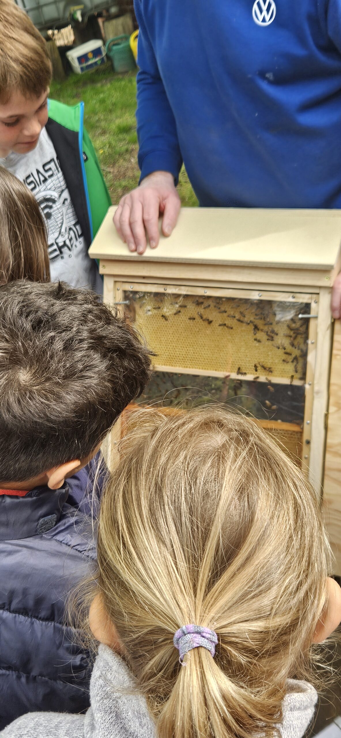 Besonders spannend fanden die Kinder die Erklärung zur regelmäßigen 9-tägigen Kontrolle der sogenannten Weiselzellen. Diese Kontrolle ist wichtig, damit keine zweite Bienenkönigin heranwächst – denn dann würde ein Teil des Bienenvolkes mit der neuen Königin ausschwärmen und den Stock verlassen. Aktuell befinden sich schon 12kg Honig in der Beute unserer Schulbienen und wir freuen uns auf das nächste Honigschleudern.