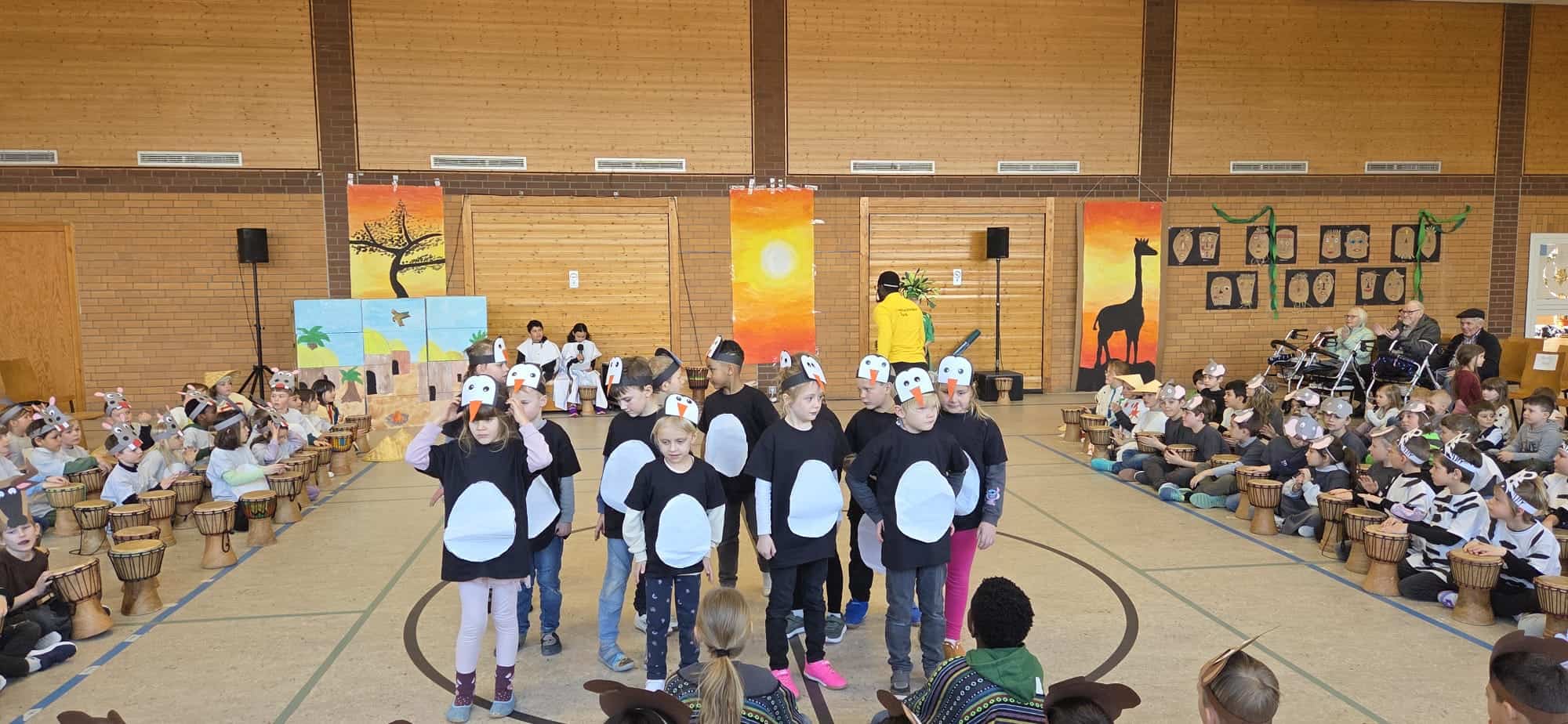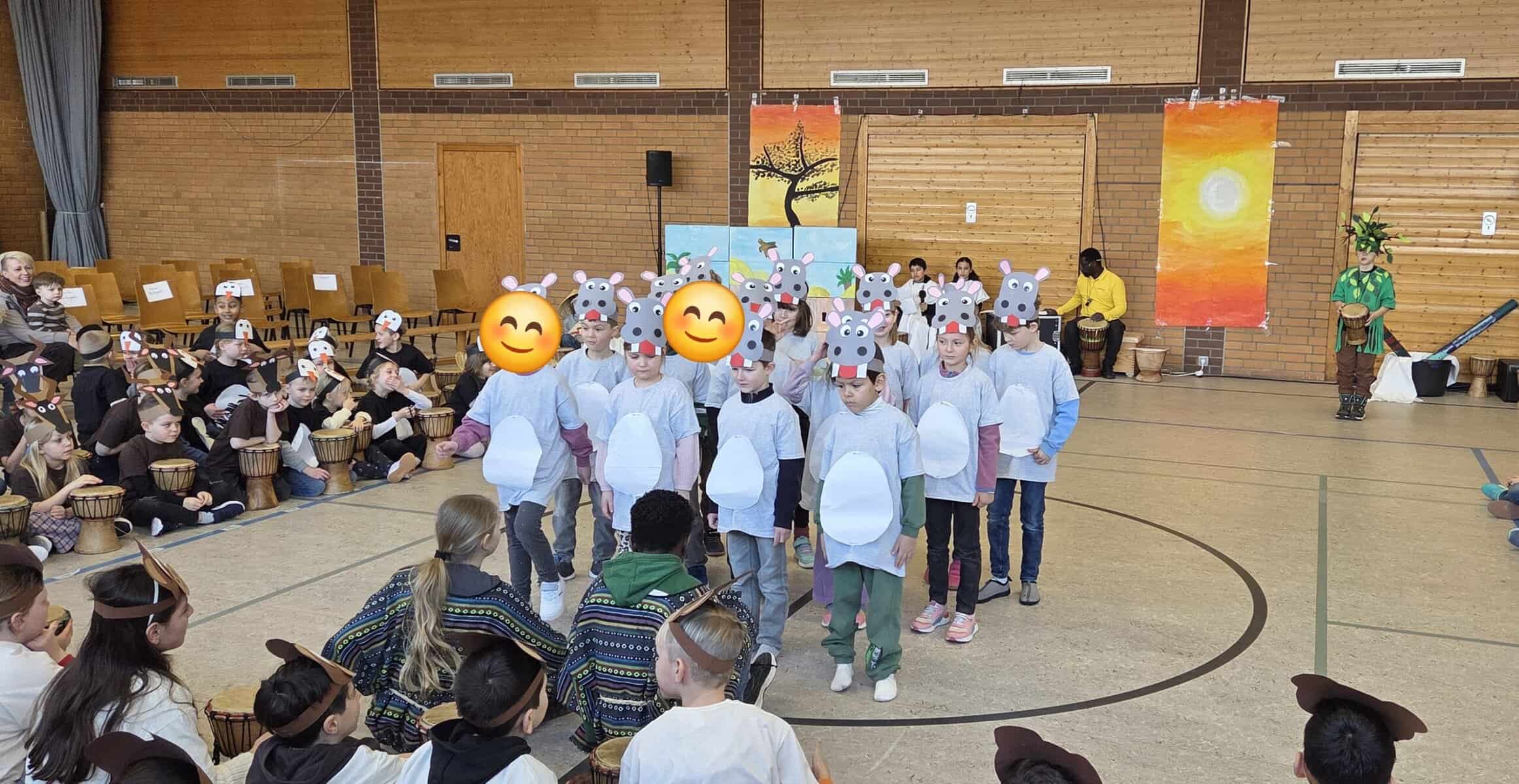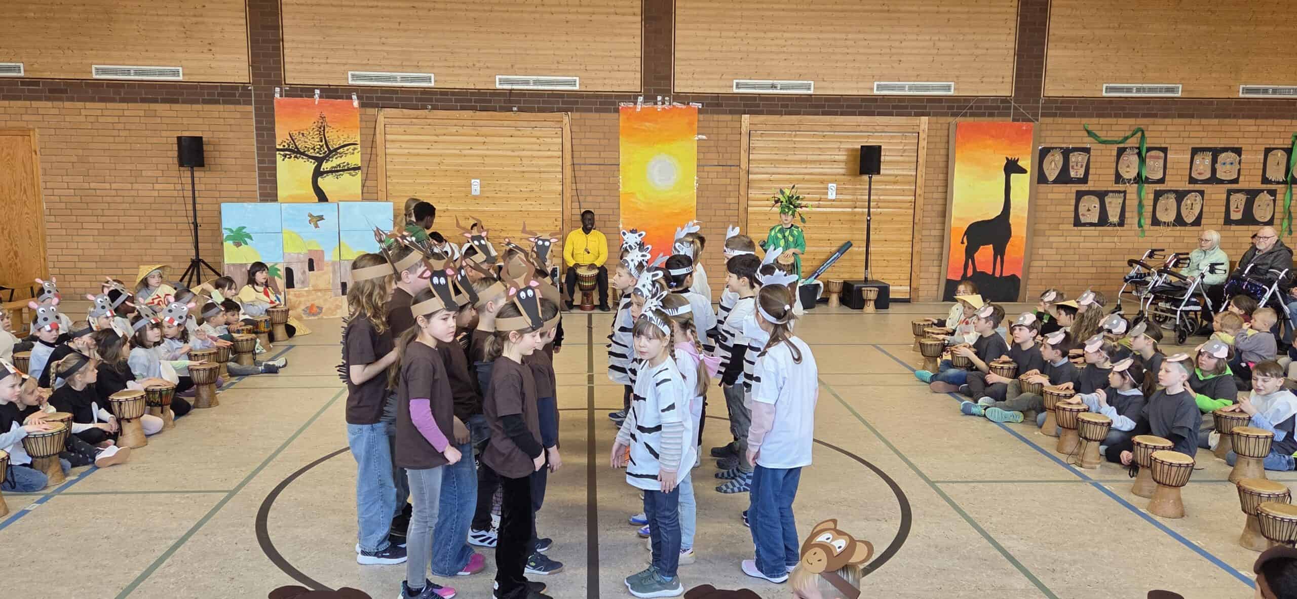 Ein herzliches Dankeschön gilt Fara Diouf, unserem Trommlerzauberer, der uns mit seiner Energie und Geduld durch diese Woche geführt hat. Ebenso danke ich unseren Kolleginnen und Kollegen im Vor- und Nachmittag für ihren unermüdlichen Einsatz beim Basteln der Kostüme und Kulissen. Vielen Dank an die Eltern für die tatkräftige Unterstützung beim Basteln, beim Aufbau sowie für das wunderbare, reichhaltige und bunte Buffet am Ende der Veranstaltung.