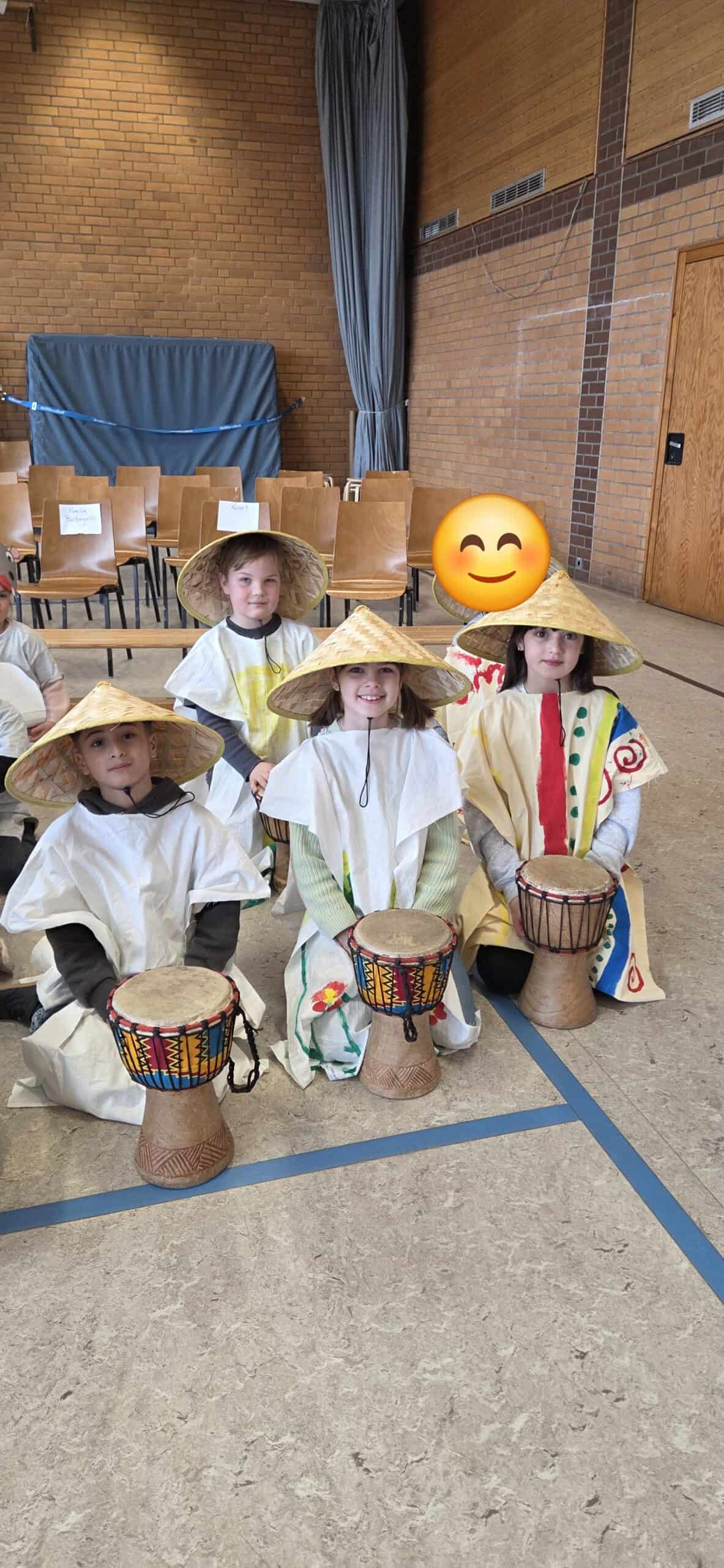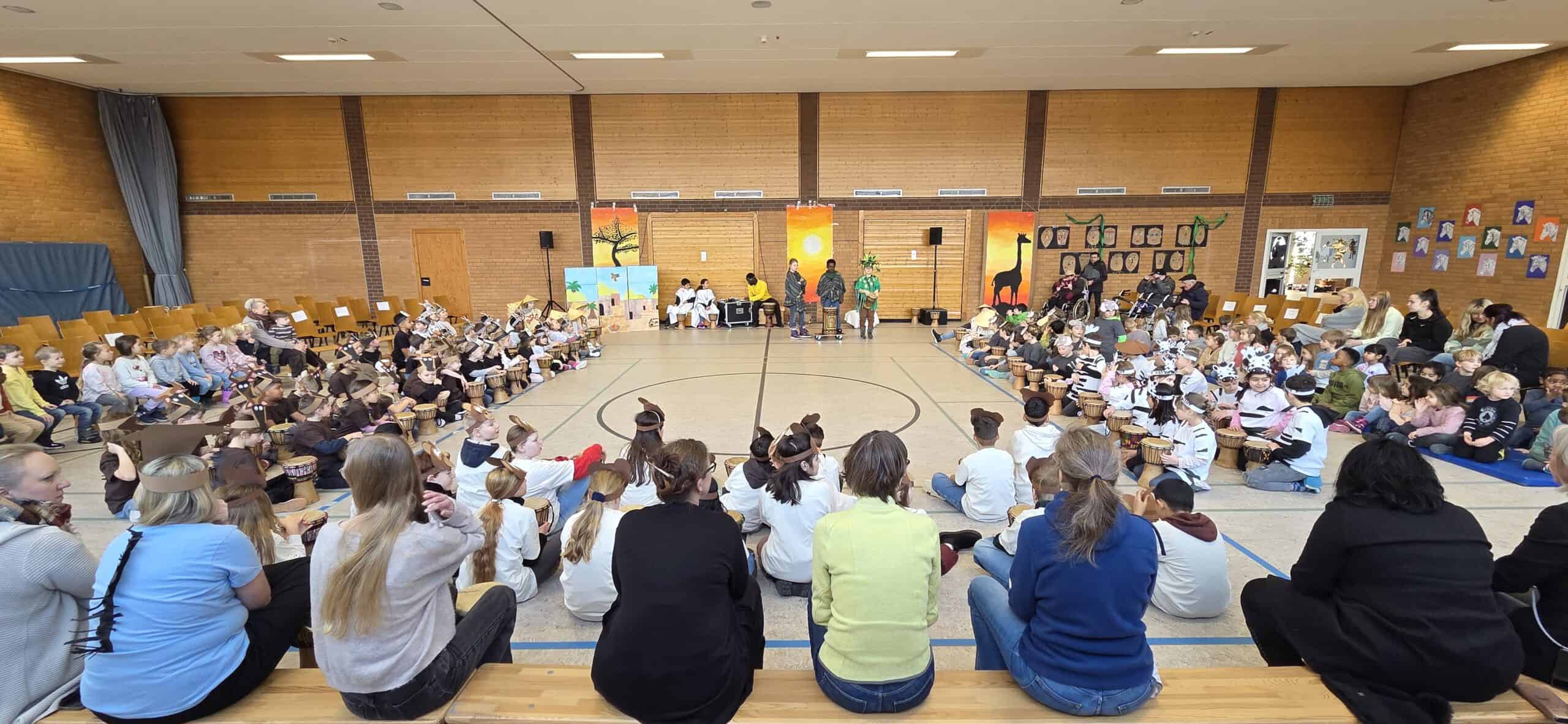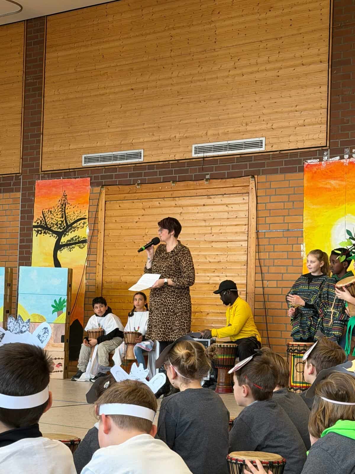 Ein herzliches Dankeschön gilt Fara Diouf, unserem Trommlerzauberer, der uns mit seiner Energie und Geduld durch diese Woche geführt hat. Ebenso danke ich unseren Kolleginnen und Kollegen im Vor- und Nachmittag für ihren unermüdlichen Einsatz beim Basteln der Kostüme und Kulissen. Vielen Dank an die Eltern für die tatkräftige Unterstützung beim Basteln, beim Aufbau sowie für das wunderbare, reichhaltige und bunte Buffet am Ende der Veranstaltung.